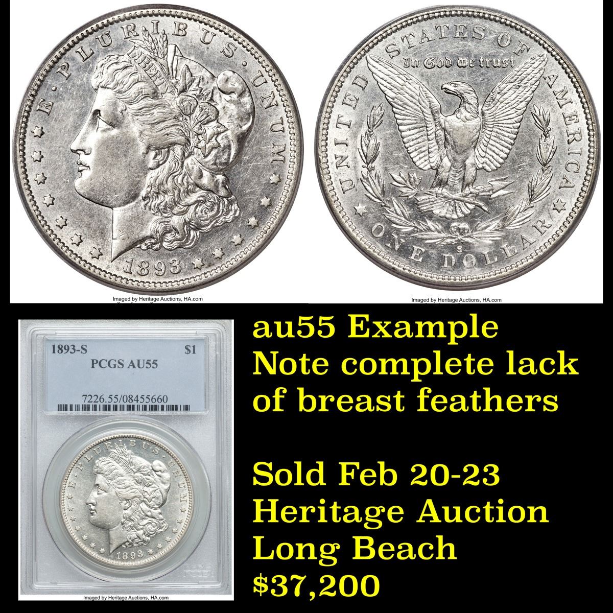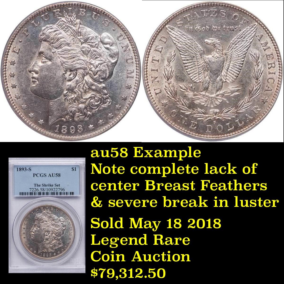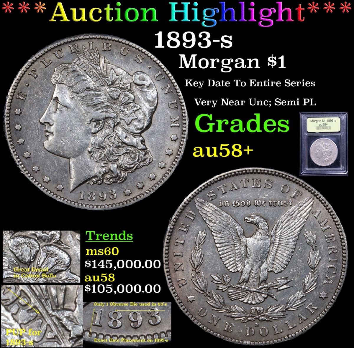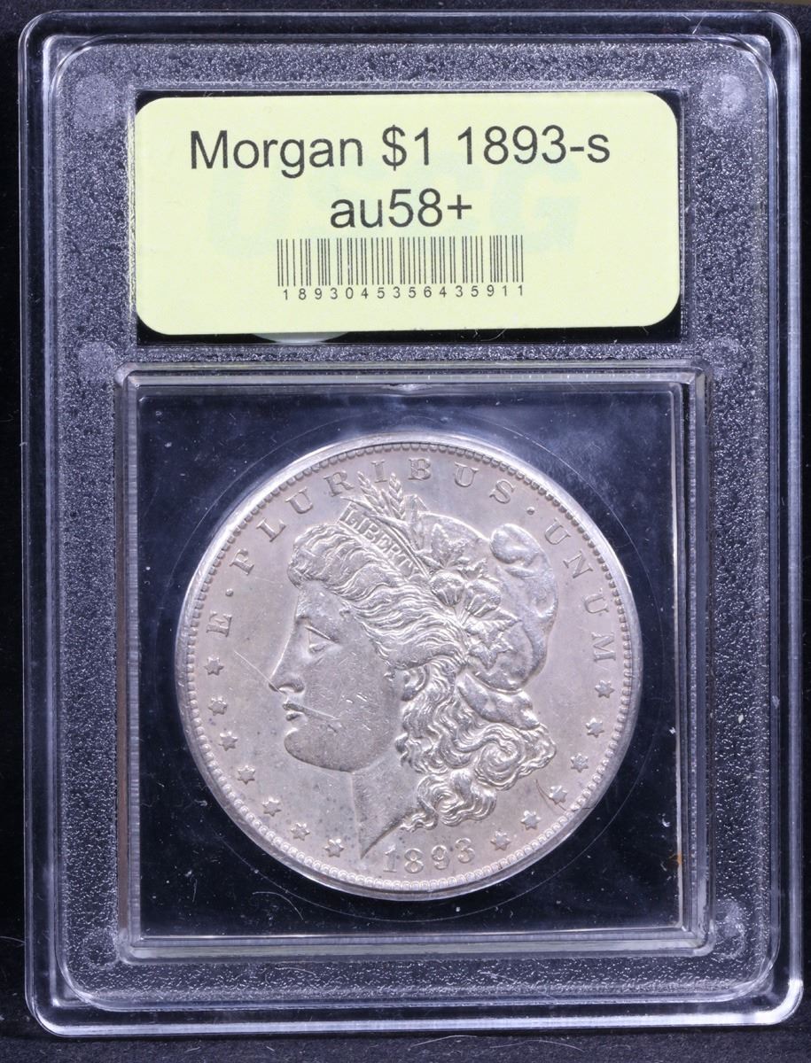 ***Auction Highlight*** 1893-s Morgan Dollar $1 Graded Choice AU/BU Slider+ By USCG. Up for auction is the rarest of the rare. The legendary 1893-s Morgan Dollar. This example is far and away the finest example we have had the privilege to bring to auction. I have given you closeups of the key pick up points and some detail elements. When authenticating an 1893-s, you can spot the line in the T in even the very lowest grades. As some background into this Numismatic Legend; The financial Panic of 1893 brought about the repeal of the Sherman Silver Purchase Act and put an end to the mandated production of millions of unneeded silver dollars every year. Mintages of Morgan dollars were drastically reduced at all active U.S. Mints and the Carson City facility was closed for coinage operations after 1893. Only 100,000 Morgan dollars were struck at the San Francisco Mint that year, the smallest production total of the series. The 1893-S is the acknowledged key to the series today, and high-grade specimens are especially elusive. The present coin is an attractive Choice AU/BU specimen, with just a touch of wear on the well-detailed design elements. Both sides retain significant amounts of original mint luster, with traces of prooflike reflectivity in selected areas. A few hints of golden-tan and lavender toning visit the lightly abraded surface. Trends on this Ultimate Key to the series are as follows: ms60 $145,000, au58+ $105,000, au58 $95,000, au55+ $72,500, au55 $43,500, au53+ $26,500, au53 $24,000, au50+ $21,500, au50 $20,000. I have included three pictures of pcgs graded 1893-s for reference, and shown the accompanying grade. Please look carefully as This coins does not come along often. Good Luck! A Corey's Pick, Bid to Win, Don't let it get Away, you might not find its equal Coin. I give this coin my highest recommendation