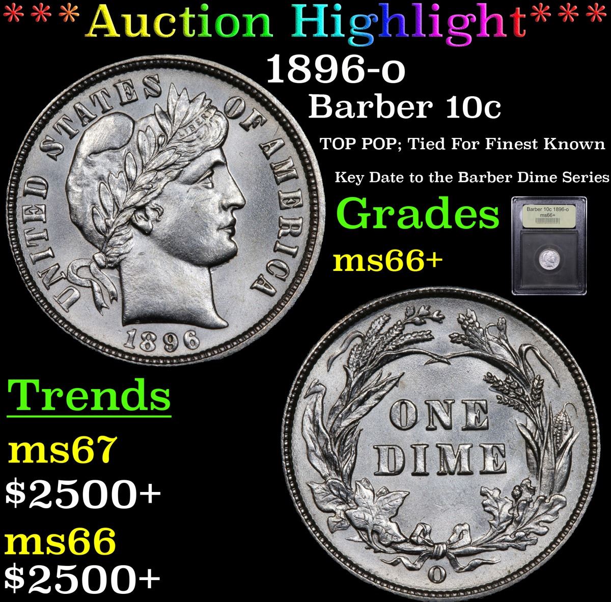 ***Auction Highlight*** 1896-o TOP POP; Tied For Finest Known Key Date to the Barber Dime Series Barber Dime 10c Graded GEM++ Unc By USCG. A much harder date. TOP POP - Up for auction is a coin tied for the finest know. It is the 1896-o Barber Dime. One of the ultra rare Keys to the entire Barber Dime Series. The 1895-o is the hands down ultimate key to the series. PCGS estimates that only 1000 survive in all grades, 80 in unc and that only 25 survive in ms65 and higher. In the 1896-o, PCGS estimates that 1250 survive in all grades, 100 in unc and in ms65 and higher only 35 examples survive. Of those 35, you are looking at a coin tied for the finest known. Stunning example, ultra clean, dynamite eye appeal, unsurpassed luster. A centerpiece of any collection. Trends on this amazing coin are $30,000 in ms67 and $13,000 in ms66. The last 3 ms66+ to go to auction brought $19,388, $20,563 and $17,038. And just as a perspective on rarity, the 1896-o Barber 10c trends $2200 in ms60. Good luck, as an 1896-o in this condition may only come by once every few years in any auction! A Corey's Pick, Bid to Win, Don't let it get Away, you might not find its equal Coin. I give this coin my highest recommendation