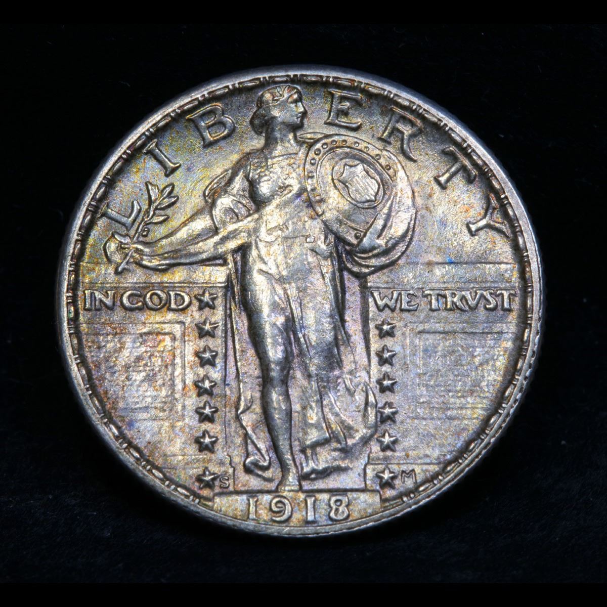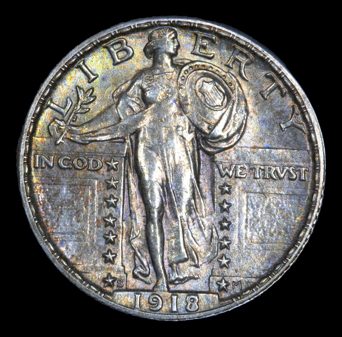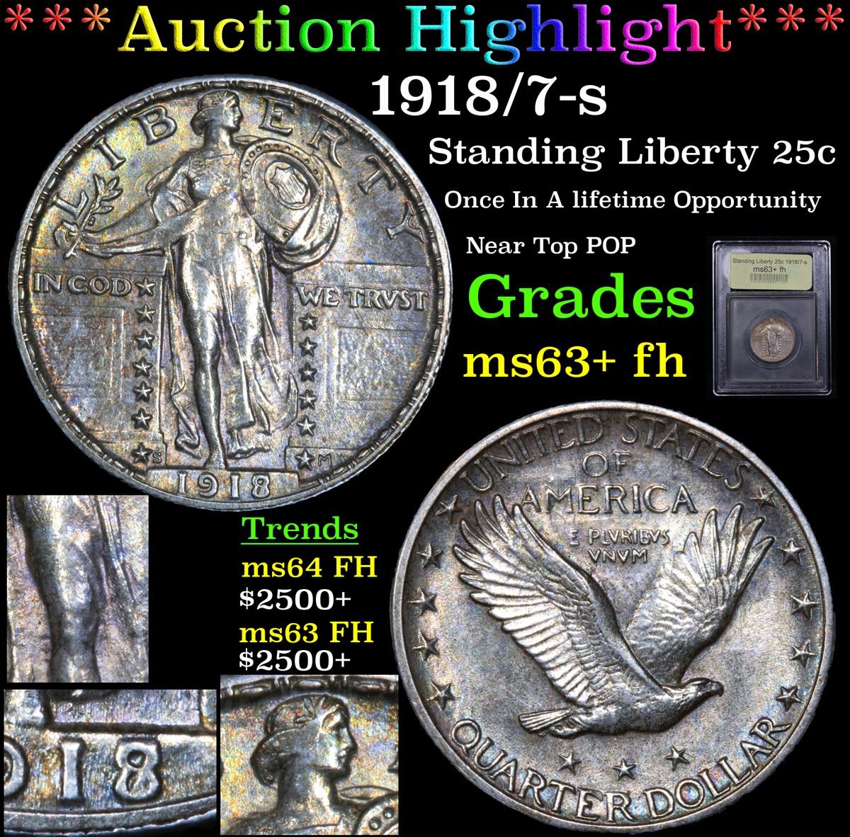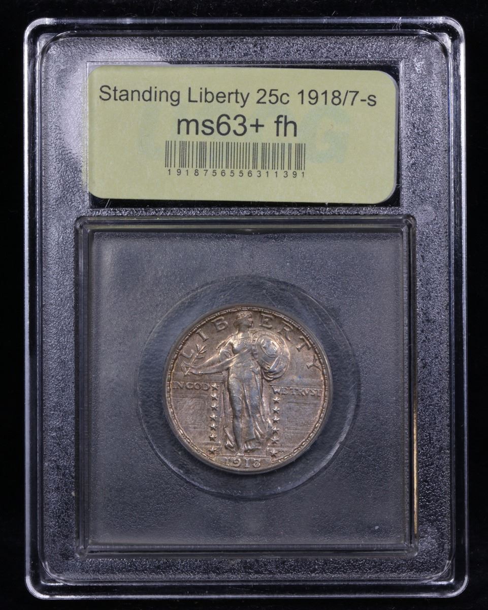 ***Auction Highlight*** 1918/7-s Standing Liberty Quarter 25c Graded Select Unc+ FH By USCG. Highlight of the Entire Auction. Possibly the Highlight of the Year. Up for Auction is the Legendary and Elusive 1918/7-s Standing Liberty Quarter. The Example at hand is well struck, with superb colorful toning. A great full head with a well rounded face and all three feathers and full hairline. The leg is perfectly rounded and the overdate is Sharp and distinctive. Please examine all of our close up photos of these design elements before deciding on a maximum bid. A once in a lifetime opportunity is at hand. Per David Hall of PCGS �: The 1918/7-S Standing Liberty quarter is one of the key date silver coin rarities of the 20th century. This variety was first noticed in the late 1930's and the first auction appearance was in December, 1937. Collectors began saving the few they could find in circulation. Today, the 1918/7-S is rare and relatively expensive even in the lowest grades. Mint state specimens are very rare and specimens with fully struck heads are extremely rare. Probably less than 100 mint state survivors exist.. There are only a handful of full head specimens and, as far as I know, there are no Gem MS65 full head specimens.� A Near TOP POP example is at Hand, Don�t let it Get Away. Bid to Win. A Corey's Pick, Bid to Win, Don't let it get Away, you might not find its equal Coin. I give this coin my highest recommendation