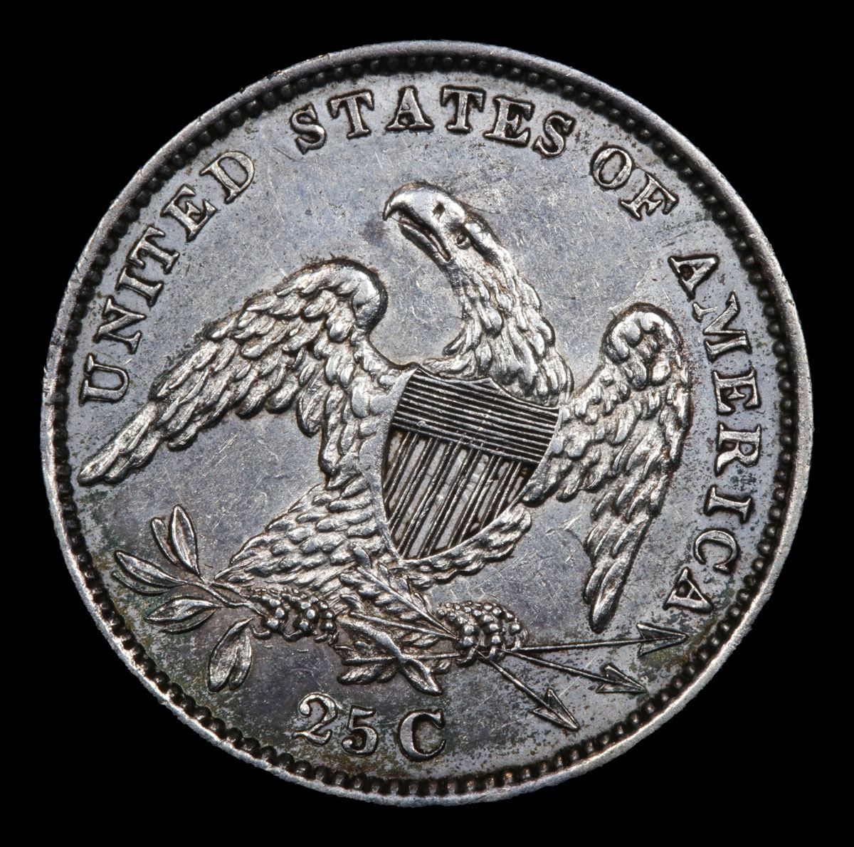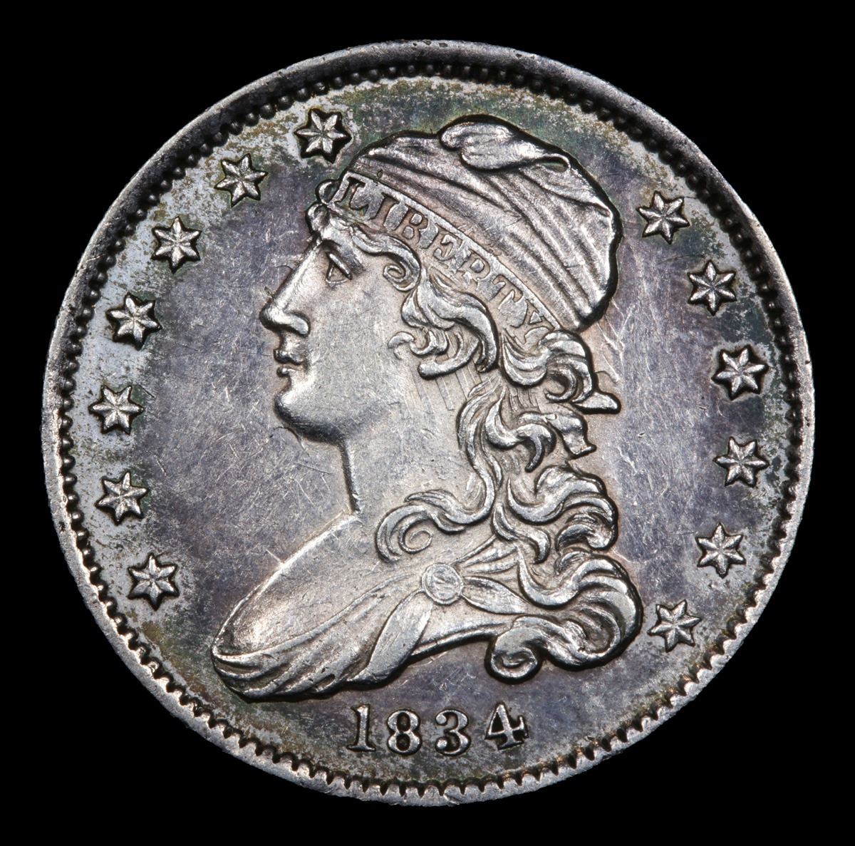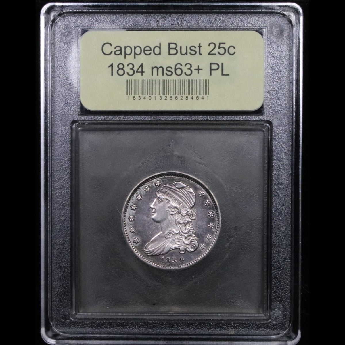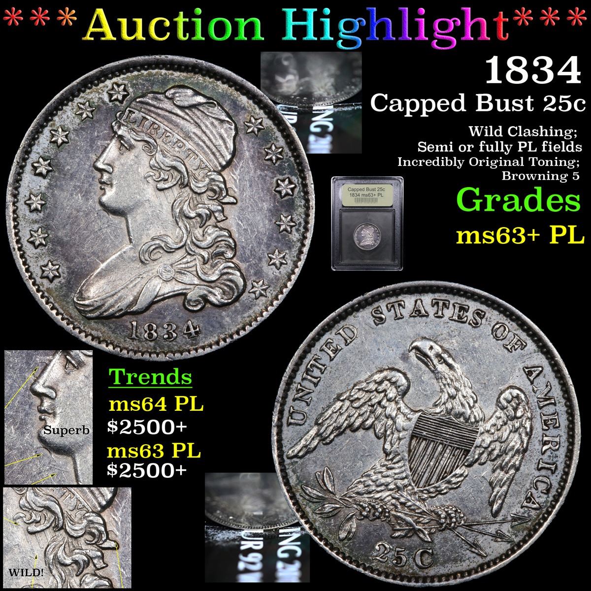 ***Auction Highlight*** 1834 Wild Clashing; Semi or fully PL fields Incredibly Original Toning; Browning 5 Capped Bust Quarter 25c Graded Select Unc+ PL By USCG. One of the most Extridanory Coins We've Had the privilege to handle. the coin is all original with terrific toning it is an incredibly Scarce Date and issue but beyond that it has some of the most outstanding and incredible die clashing ive ever seen. I've try to give you close ups of some of the more extruder parts. but it is truly a sight to behold in ones hand. the clashing marks from the shied on the rev are extradentary. additionally the fields are PL To date PCGS Has graded 1 as PL and NGC has graded 6 Proof Like. And if all that wisent enough this spectacular coin is the Brownng 5 or B-5 Varity Per Joe O'Connor Of PCGS: The 1834 Capped Bust Quarter was struck in 5 different die marriages and the B-5 Is Clearly The Rarest Die Combination and it may not survive in true Unc Condition. It Appears that Mr. O'Connor is mistaken as you are looking at the sole Surviving B-5 Unc Capped Bust Quarter A Corey's Pick, Bid to Win, Don't let it get Away, you might not find its equal Coin. I give this coin my highest recommendation