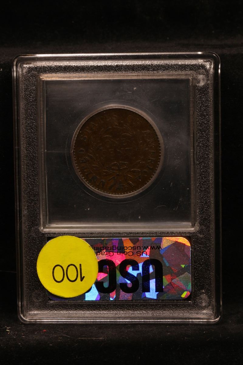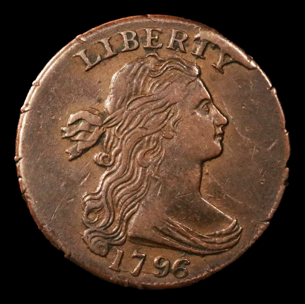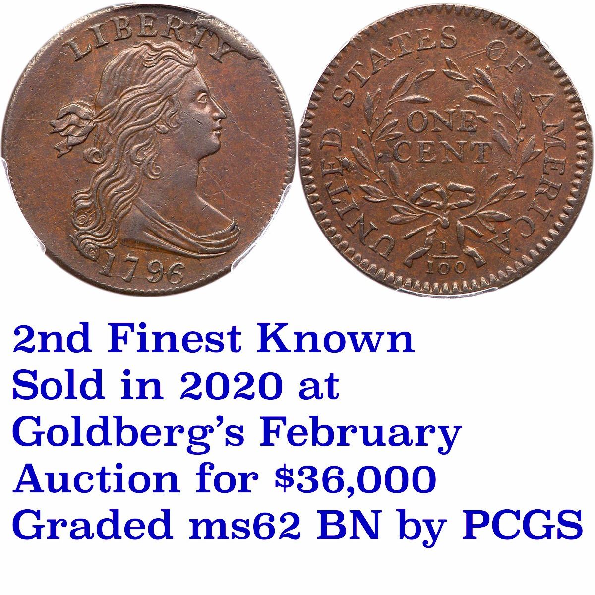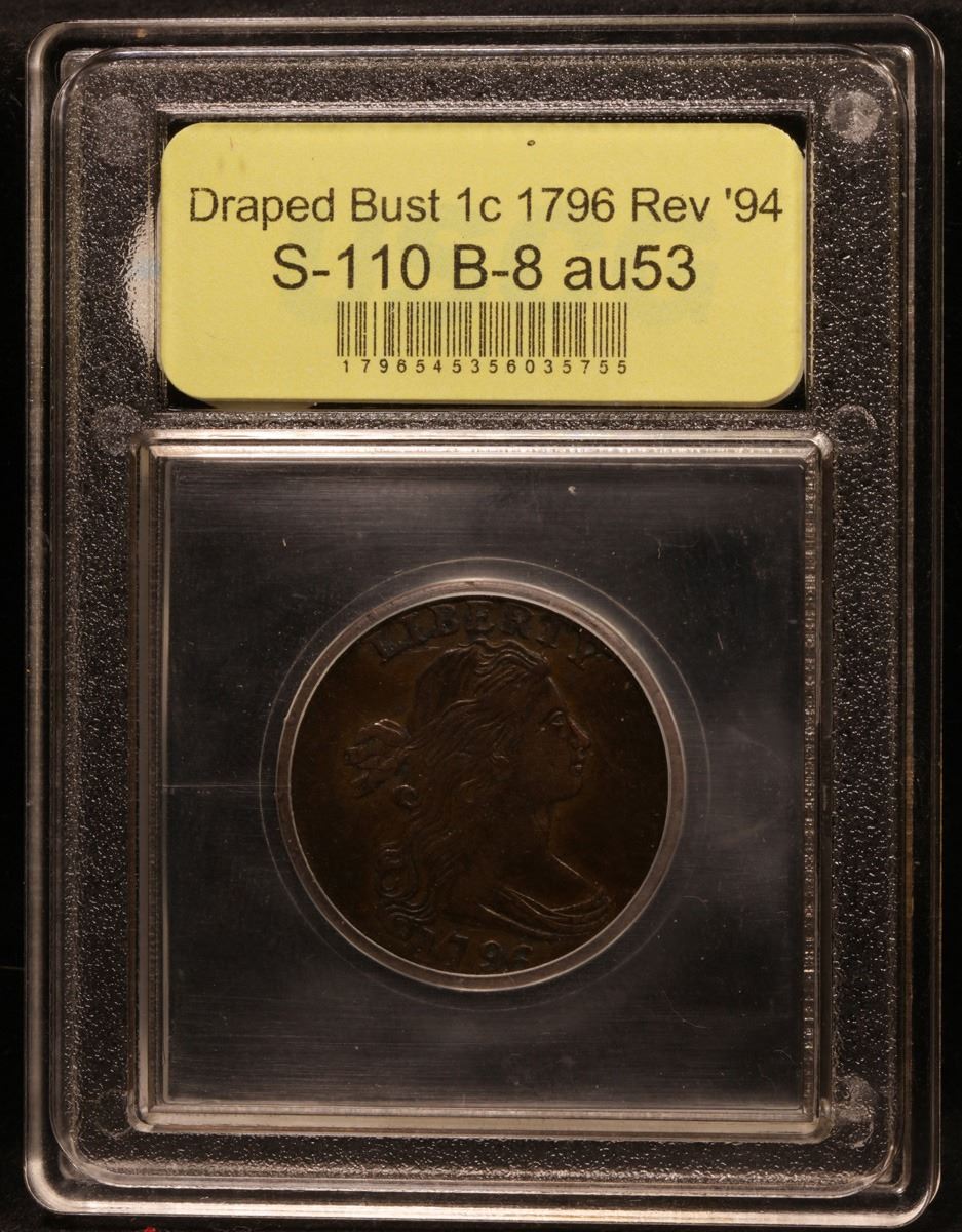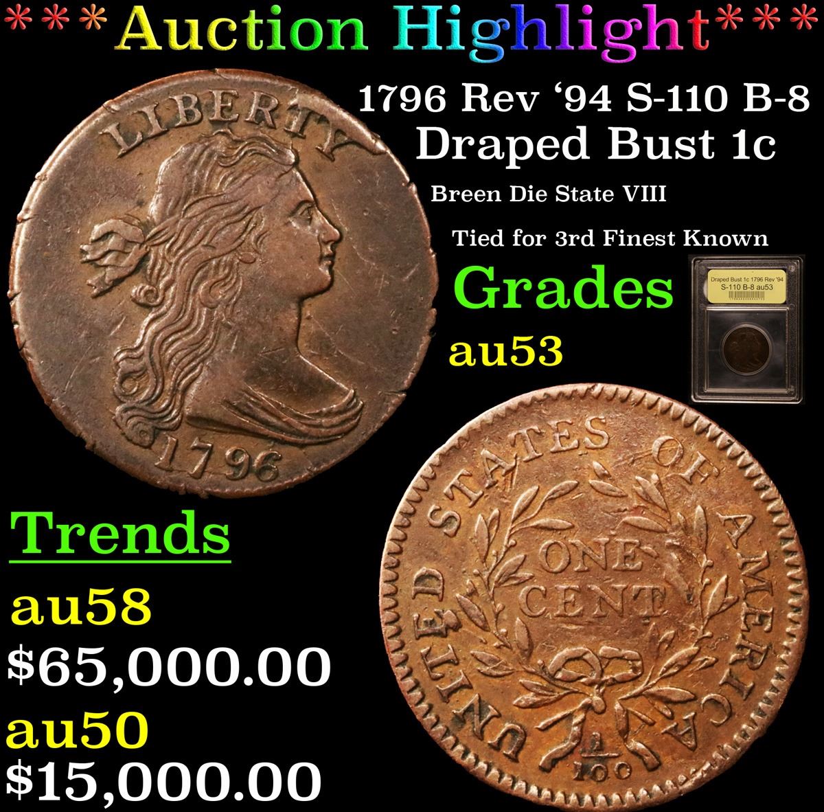 ***Auction Highlight*** 1796 Rev '94 S-110 B-8 Draped Bust Large Cent 1c Graded Select AU By USCG. Up for Auction is an Ultra Rare 1796 Reverse of 1794, Draped Bust Large Cent, S-110 Variety, Breen Die State VIII. This example is Graded au53 and it is Tied for 3rd Finest Known. The example at hand has smooth surfaces, so often not seen on 1796 cents. The devices are sharp and well defined. Choice glossy medium chocolate brown with darker steel brown toning on the highpoints and slightly lighter frosty steel brown toning in the protected areas. This cent offers great eye appeal and shows only minor marks. LDS, Breen state VIII, with a strong cud break at TY in LIBERTY in addition to myriad die cracks elsewhere on the obverse The 2nd finest sold for $36,000 in 2020, and I have included a picture of that coin for your comparison. It Was graded ms62 BN by PCGS. I think our coin is very modestly graded au53 based on this ms62 bn example as reference. A Corey's Pick, Bid to Win, Don't let it get Away, you might not find its equal Coin. I give this coin my highest recommendation