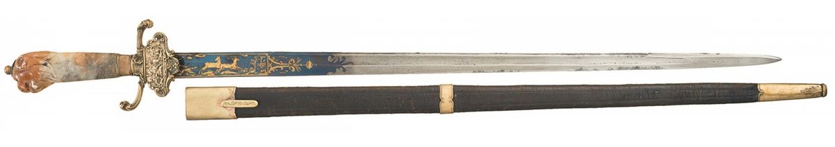 Measuring 31 3/4 inches in overall length, this is a superb example of the kind of side sword that would have been mandatory equipment for a European nobleman on the hunt. Worn as a counterpart to a spear or firearm, the hunting sword gave the hunter an extra layer of security if the game got too close, as well as a means to dispatch a wounded animal once the chase had come to an end. Seen in both plain, utilitarian configurations and very well decorated ones, this example rests on the latter end of the scale, with the 26 inch double fuller blade showing an 8 1/4 inch panel of rich niter blue extending from the ricasso, with a gold accented arrow on the flat spine, an engraved and gold highlighted scene of a hunter on foot with 2 dogs on the left, and antlered game being pursued by a dog on the right. Gilt brass guard, with a sculpted scroll pattern on the dual quillions, engraving around the collar, and a raised scroll and floral bordered languet with a scene of the climax of a boar hunt; the boar cornered between a pair of hunting dogs and a spear-equipped horseman preparing to deliver the killing blow while his fellow hunters look on. The hilt is carved jade, starting with a dark color at the collar, transitioning to a mixed white and ending with a brown at the pommel, which is topped with a gilt brass ball and carved in the shape of a lion's head. The scabbard is black leather, with delicate scroll engraving on the throat, middle band and tip. Completing the set is a highly attractive hunting belt, 37 1/4 inches long and 2 1/8 inches wide, constructed with a red leather backing on black velvet, decorated with golden bullion wire borders and a pattern of interwoven thorned vines on the main body and on the integral frog, and a pair of gilt finished buckles bearing the same thorned vine pattern. A similar example is specially featured in the Hunting Museum in Munich.