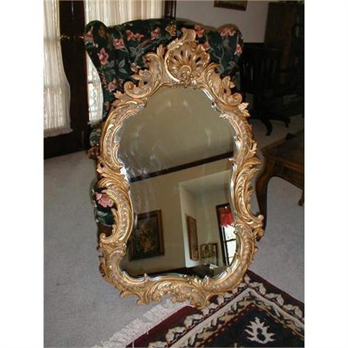 This mirror is a great accessory for that area needing a touch of class. The mirror frame is solid wood that has been hand carved into very beautiful accanthus leaves, shells and roses. The mirror itself is beveled to match the shape of the frame. The relief ( depth) to the carving is fantastic. While this piece amy not be old enough to call an antique, it certainly will highlight any room, antiques or not.