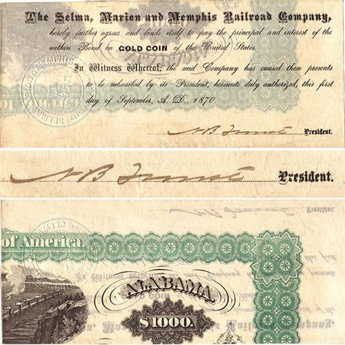 Signature is on a panel of the bond which 3 3/4 inches high by 8 3/8 inches wide and is darkly penned in brown ink. The railroad bonds are now basically the most affordable format for obtaining an authentic Forrest signature with no risk of deception. Forrest served as president of this railroad and then resigned as a result of the Panic of 1873, a national crisis which nonetheless severely impacted many businesses, banks and railroads across the south. The 1873 debacle struck in the midst of Reconstruction woes, a period in which civil liberties had been severely restricted by federal authorities and a lack of liquidity in the south weakened any entrepreneurial venture such as that by Forrest and his associates. The Selma, Marion and Memphis Railroad had been started by Confederate General Gideon Pillow and thus this enterprise was strongly imbued with the energy and vision of southern military men whose role in the war had reduced their wealth, status and opportunities. BRIEF MILITARY OVERVIEW: With no formal military training, Nathan Bedford Forrest became one of the leading cavalry figures of the Civil War. The native Tennessean had amassed a fortune, which he estimated at $1,500,000, as a slave trader and plantation owner before enlisting in the Confederate army as a private in Josiah H. White's cavalry company on June 14, 1861. Tapped by the governor, he then raised a mounted battalion at his own expense. His assignments included: Lieutenant Colonel, Forrest's Tennessee ...