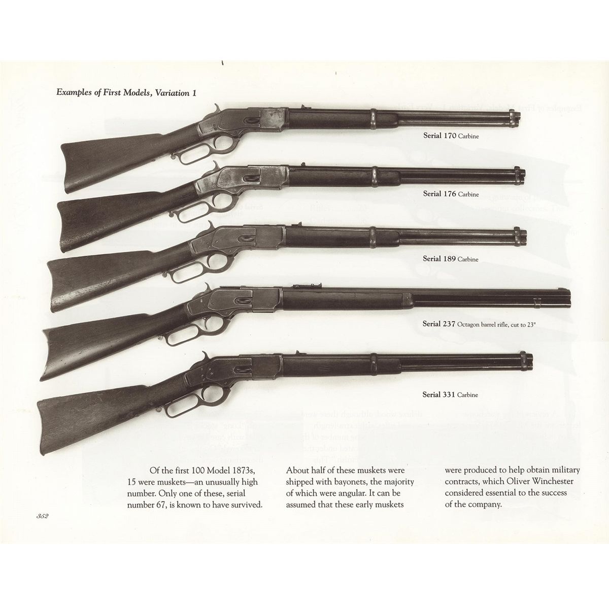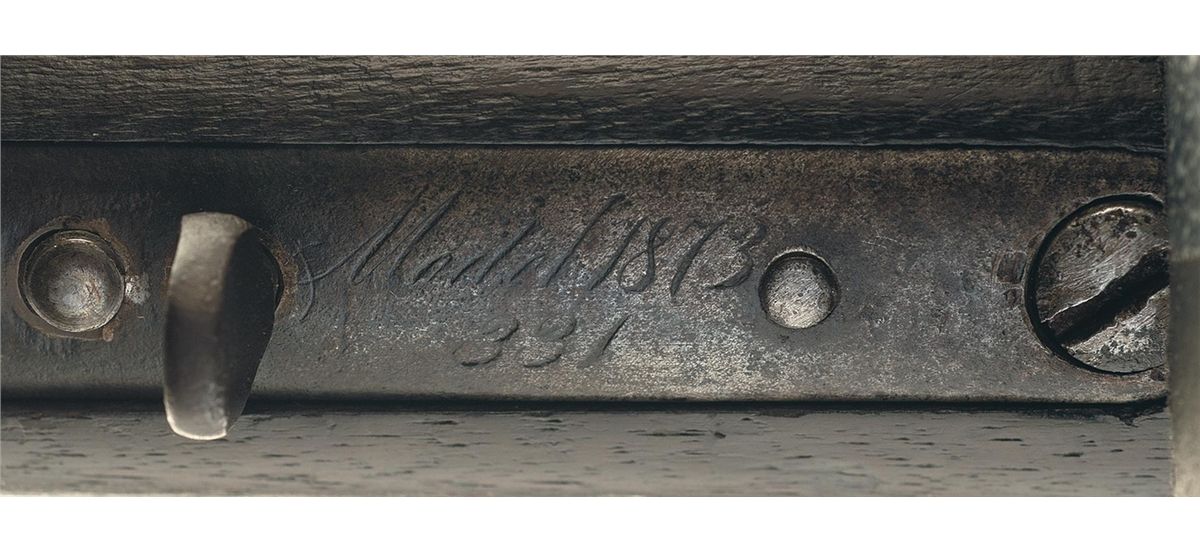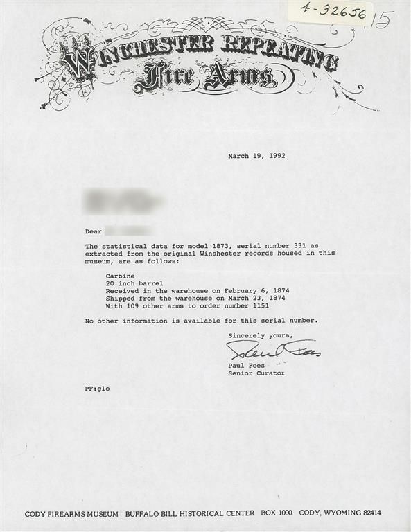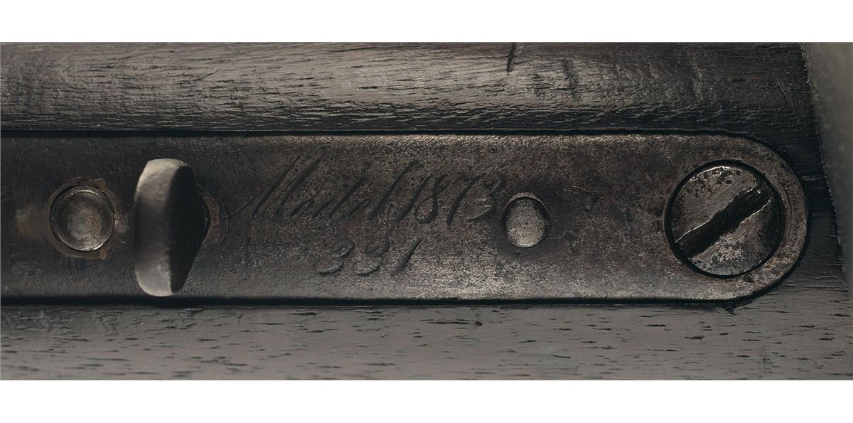 Winchester First Model 1873 Carbine with Winchester Factory Letter (photocopy) that states this carbine was shipped from the Winchester warehouse on March 23, 1874. Early production Model 1873 Carbines are rare. This exact Model 1873 SRC is photographed on the bottom of page 352 of "Winchesters New Model of 1873 A Tribute" Volume II by James D. Gordon. Author James Gordon identified six First Model, First Variation Model 1873 Carbines in his survey of 3,847 Model 1873 Rifles and Carbines. This carbine has the distinctive early features that include the receiver with integral dust cover, raised oval dust cover thumbprint, trigger with integral pin and no block first style non-adjustable leaf rear sight, upper barrel band with integral front sight blade, threaded magazine cap and carbine buttplate with sliding iron trap. The lower tang has the distinctive script two-line model designation and factory engraved serial number marking "MODEL 1873/331" found only on early Model 1873 rifles and carbines. The upper tang is not marked. The barrel is roll-stamped with the Type II marking "WINCHESTER'S-REPEATING-ARMS. NEW HAVEN. CT./KING'S-IMPROVEMENT-PATENTED-MARCH 29. 1866. OCTOBER 16. 1860" ahead of the rear sight. The brass cartridge elevator is not marked. A staple mounted saddle ring is attached to the left side of the receiver.