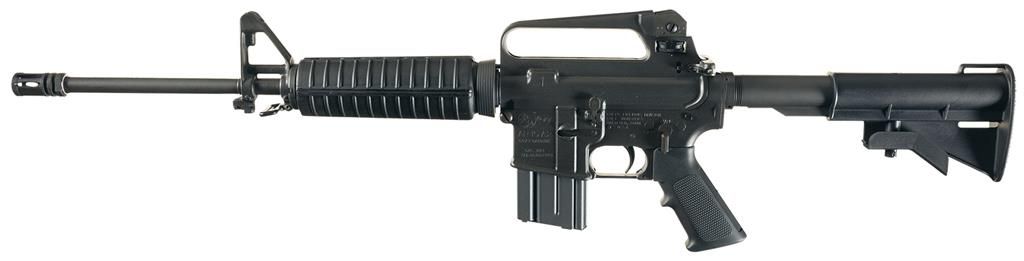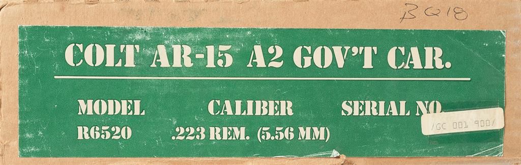 This is an excellent like new, unfired pre-ban Colt AR-15A2 carbine. This model was the standard AR15 Carbine that was available from Colt in the late 1980s until the 1994 assault rifle ban was implemented. This model has the "A2" rifle configuration upgrades as developed in 1984/85 by the U.S. Army that included the standard upper receiver with the forward assist and brass deflector and fixed carrying handle with the 800 meter adjustable rear sight. The lower receiver has the flat side as used on the commercial AR15s with the original Colt two-position sliding plastic buttstock. It is fitted with the standard weight chrome lined Carbine barrel with a 1-7 inch twist for the heavier M855 type ammunition, with the original Colt short Carbine length handguards. The left side of the magazine well is marked "COLT AR-15 A2/GOV'T CARBINE/CAL. 223/ SER. GC 001900". This highly desirable pre-ban carbine comes complete with the original Colt matching numbered, green label cardboard shipping box and original accessories which include two 20 round magazines, cleaning kit, bore brushes, black canvas sling and instruction manuals, all still wrapped in their plastic bags.