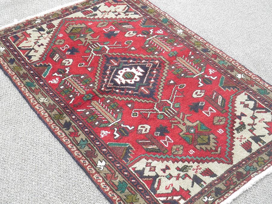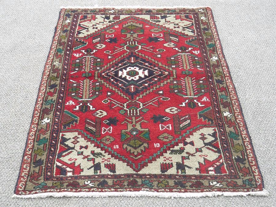 Highly Detailed Hand Woven Persian Hamadan. Size 4.11 X 3.4 feet, made of fine quality baby lamb's wool pile on cotton foundation, all natural vegetable dye. The combination of floral and geometrical desgin on a red background. The artist has used symmetrical geometric design incoporating navy and beige color on the sides ad well as the both ends. This peice has a unique gorgeous design and well worth the investment. Hand woven in Hamadan, Iran.