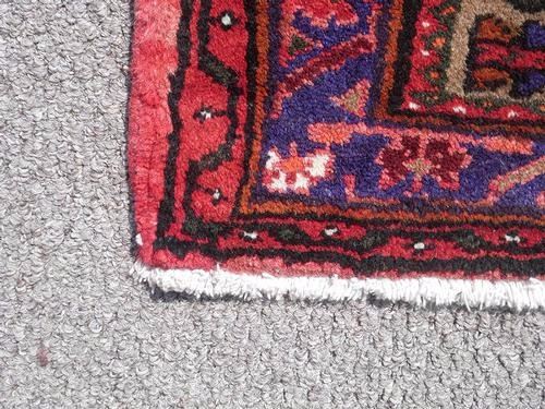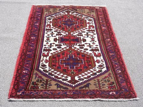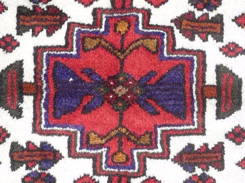 Highly Detailed Hand Woven Persian Hamadan. Size 5.4 X 3.5 feet, made of fine quality baby lamb's wool pile on cotton foundation, all natural vegetable dye, incorporating three central medallions, two are in a larger size with geometrical design in red on a white background. Great contrast in the variety of colors. Hand woven in Hamadan, Iran. About Hamadan rugs: Hamadan is the capital of an eponymous province, and it's one of the oldest cities in Persia. It's also one of Persia's most productive and diverse weaving centers. Over the years, many refugees, minorities and ethnic groups have inhabited the area. Like other cities in the western part of Persia, Hamadan produced fine, coarse carpets that are made with the symmetric Ghiordes or Turkish knot. Due to the sheer number of villages in the province of Hamadan and the area's ethnic diversity, many unique designs are featured in these regional rugs. Traditionally, Hamadan has been a center for commercial carpet production. The fragmented ethnic groups that have historically lived in Hamadan include Kurds, Azeri Turks and Islamic people. Antique Hamadan rugs traditionally favor angular designs although large-scale arabesques and curvilinear motifs are also found. They are closely related to rugs produced in the neighboring areas of Bibakabad, Shiraz, Lilian and Dozens of cities that produce local styles.