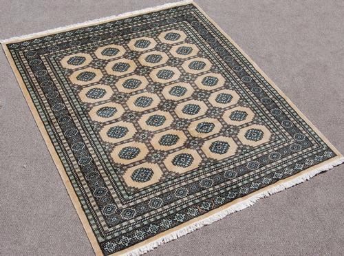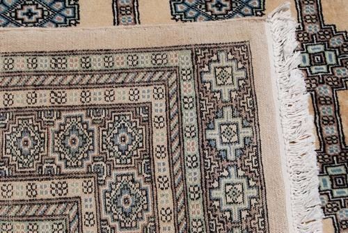 Super quality hand made fine Bokhara rug, size 7 x 8.1 feet, made of all natural, vegetable dye, hand woven, worsted wool pile on cotton foundation. This is a beautiful Bokhara the wool pile is so soft that it feels like velvet to the touch. All over geometric design, please notice the extra skirt at both ends, celebrating the start and finish of the weaving process. Creases are due to fold and not a defect. It is noteworthy that the production of Bokhara rugs has dwindled substantially in the past couple of years and therefor affecting their availability in the marketplace, making them subsequently more desirable and sought after. Hand woven in Pakistan.