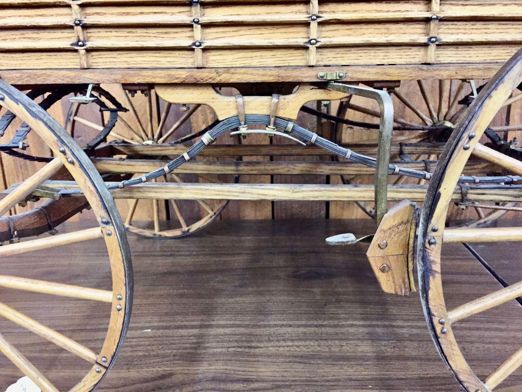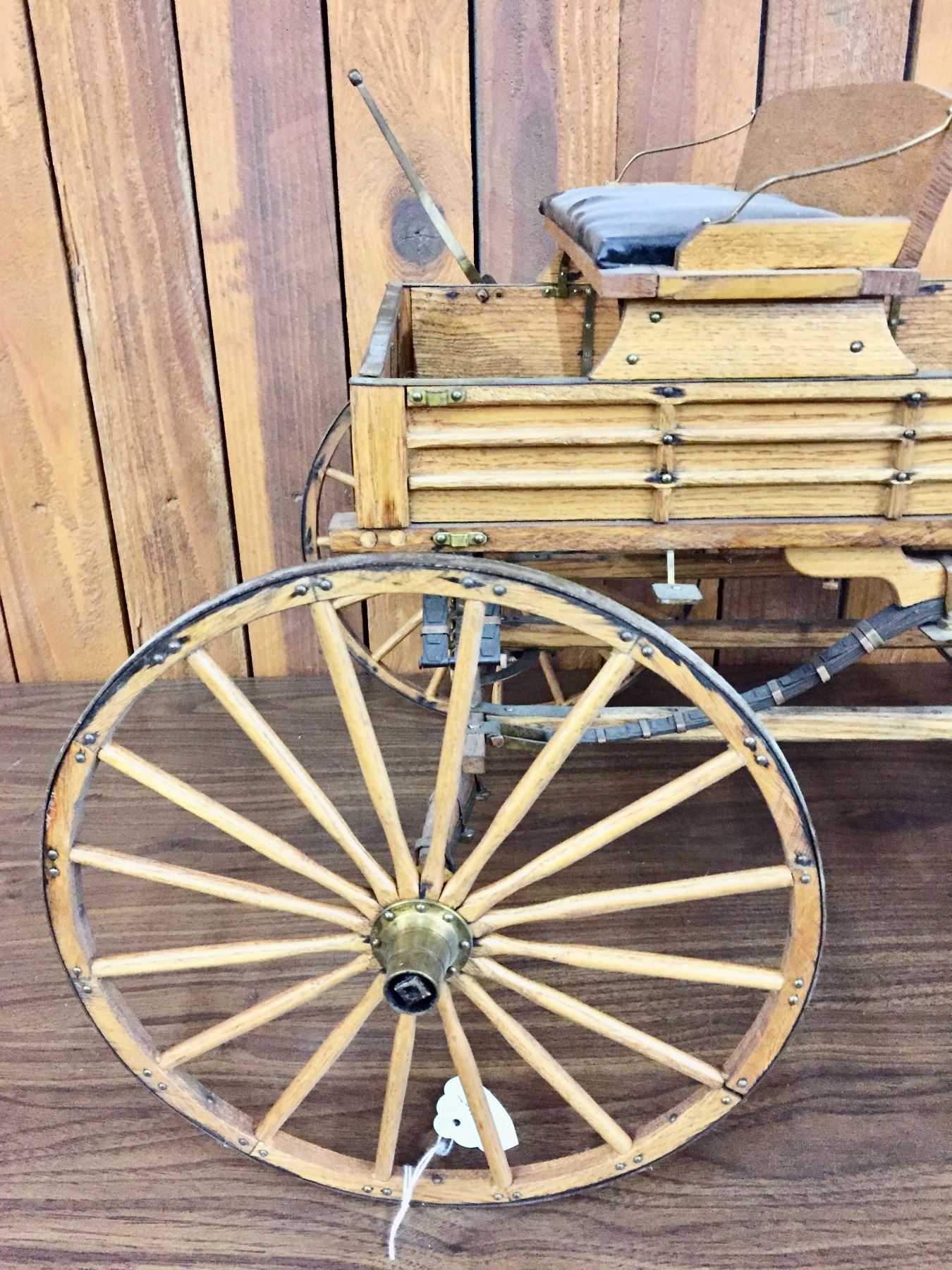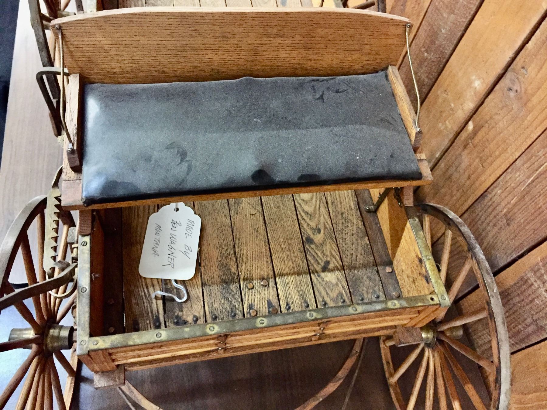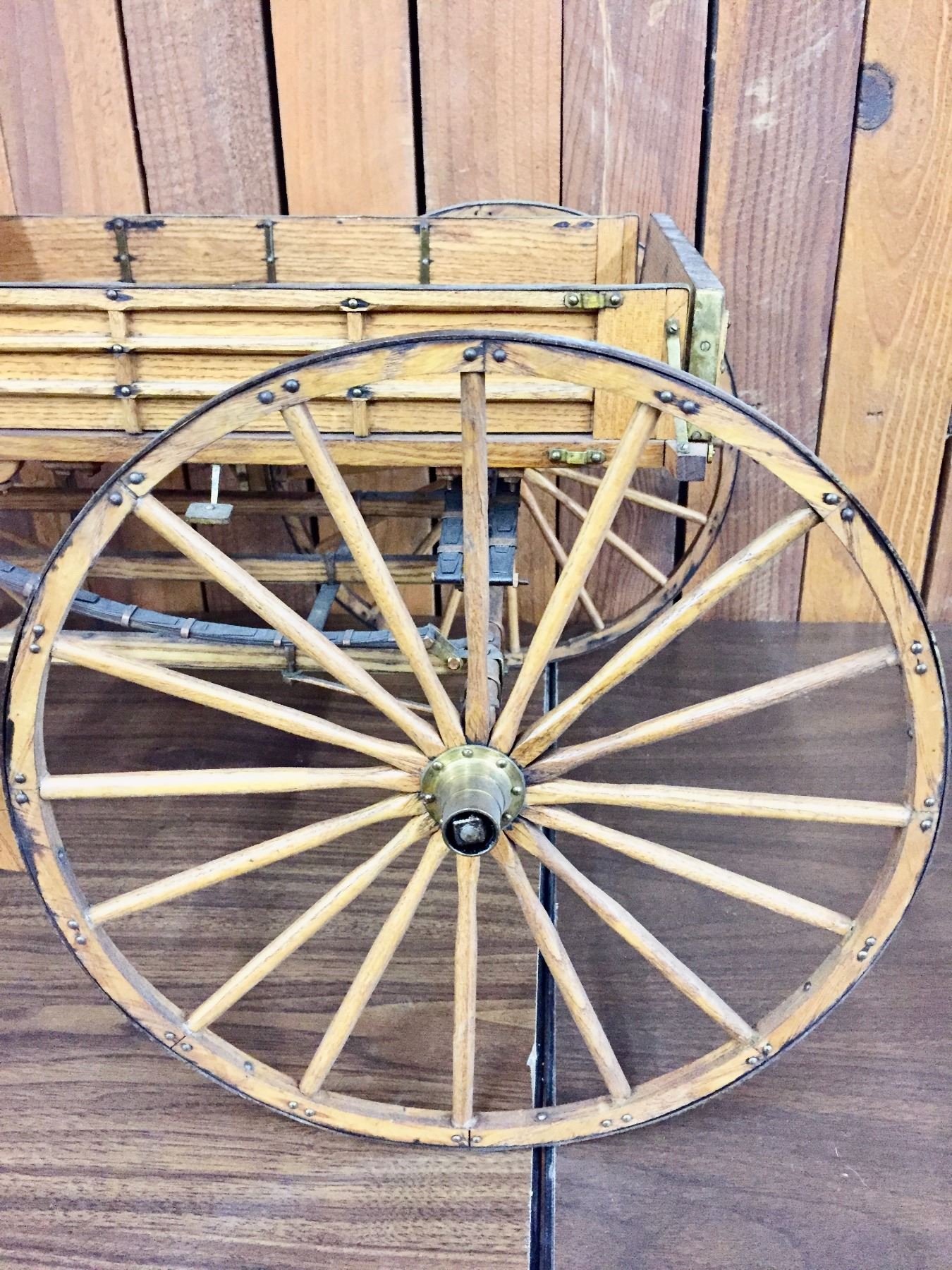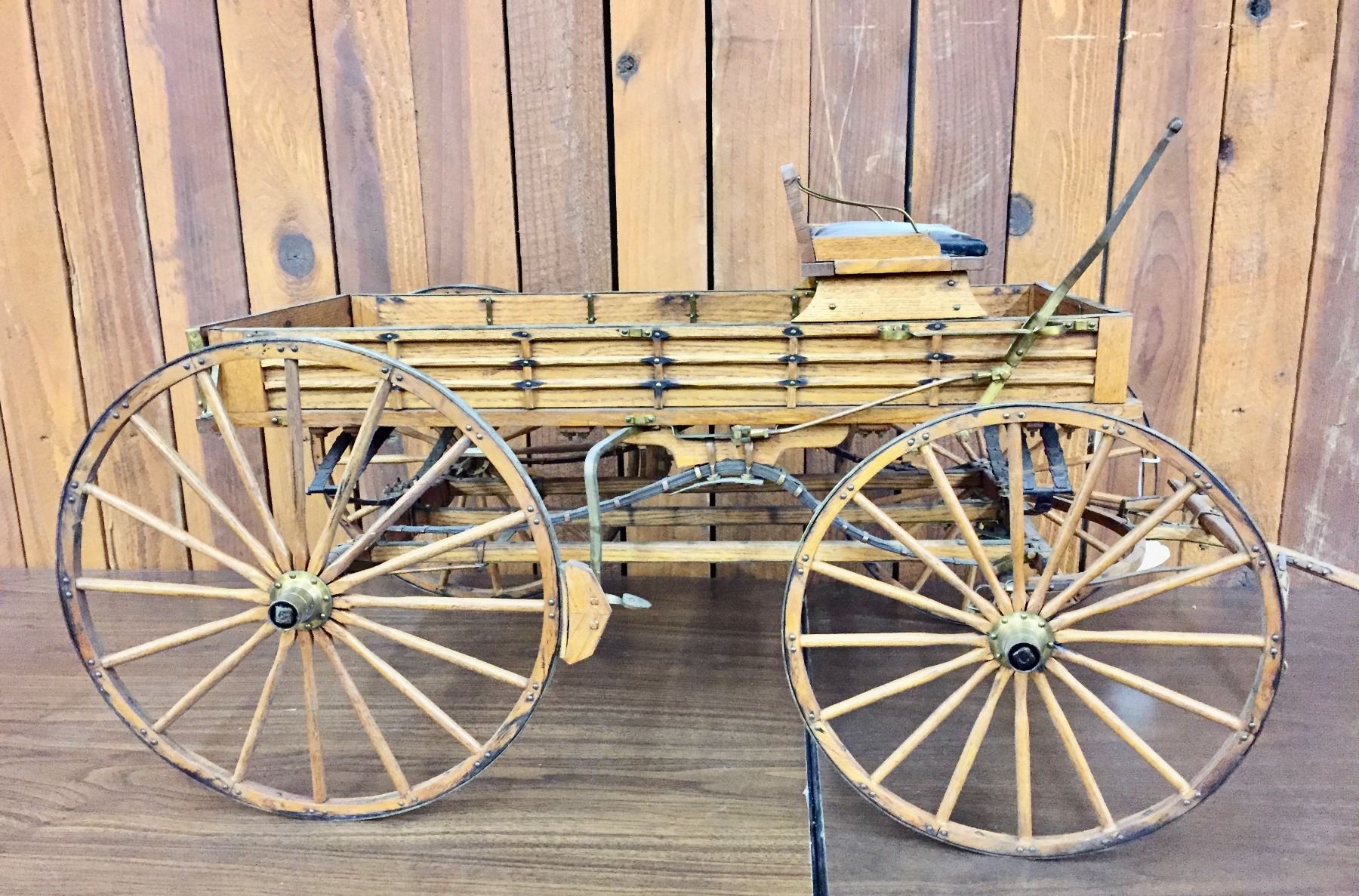 Description: For sale in this lot is this highly detailed wooden mini wagon created by the known artist, Ben Wagner. Maker: Ben Wagner, Montana.