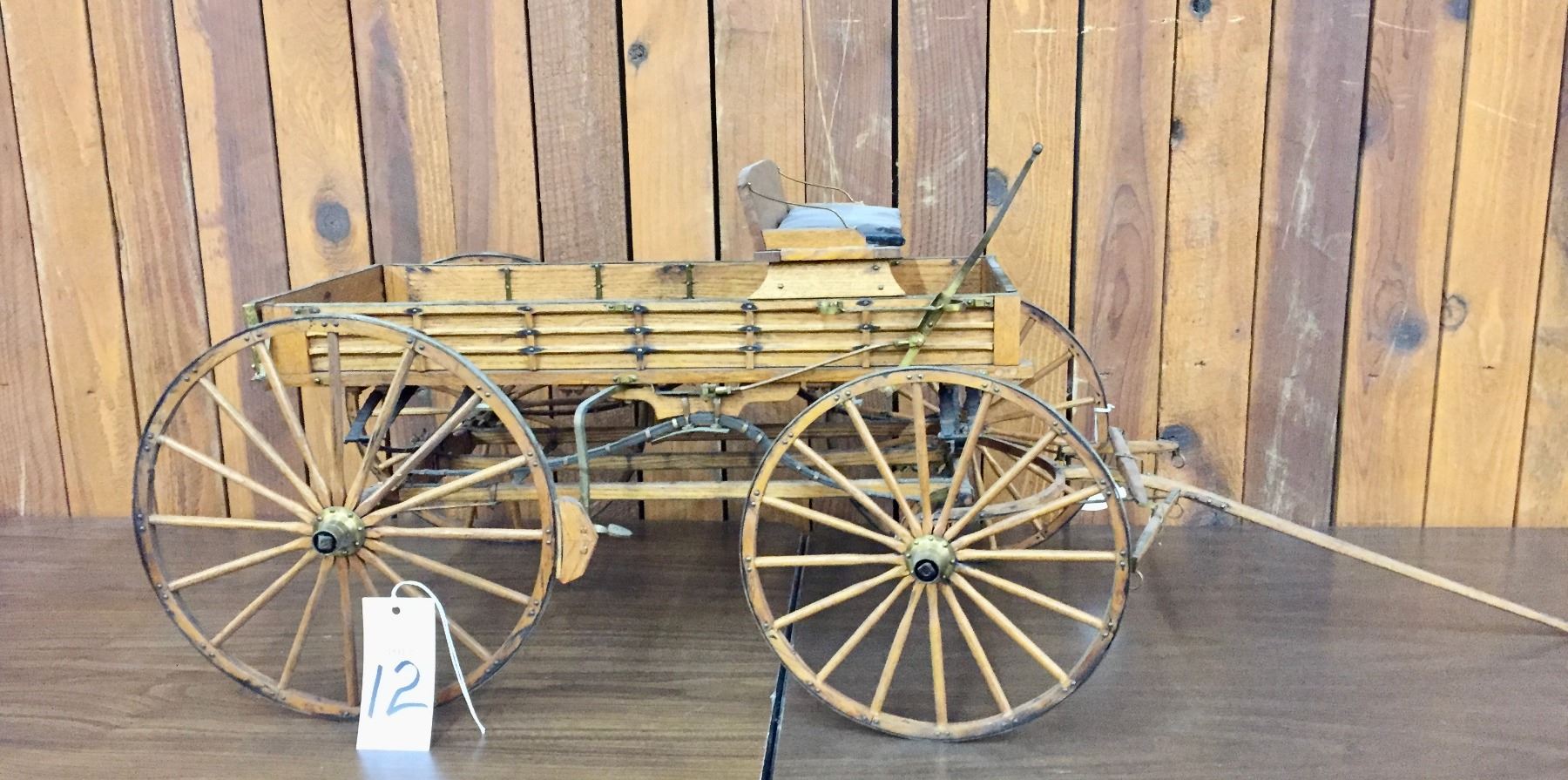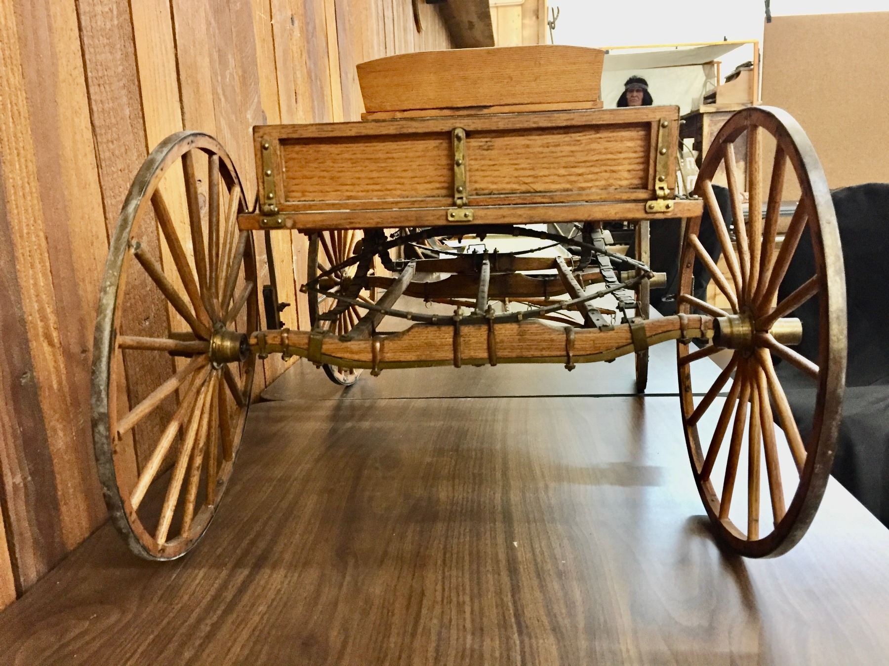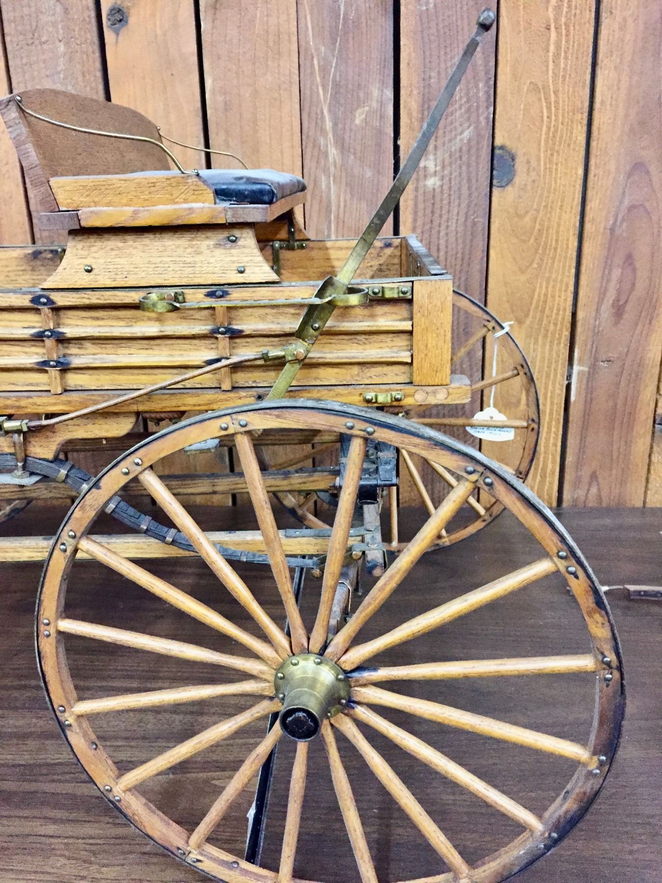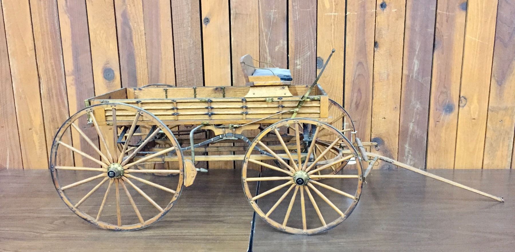Description: For sale in this lot is this highly detailed wooden mini wagon created by the known artist, Ben Wagner. Maker: Ben Wagner, Montana.