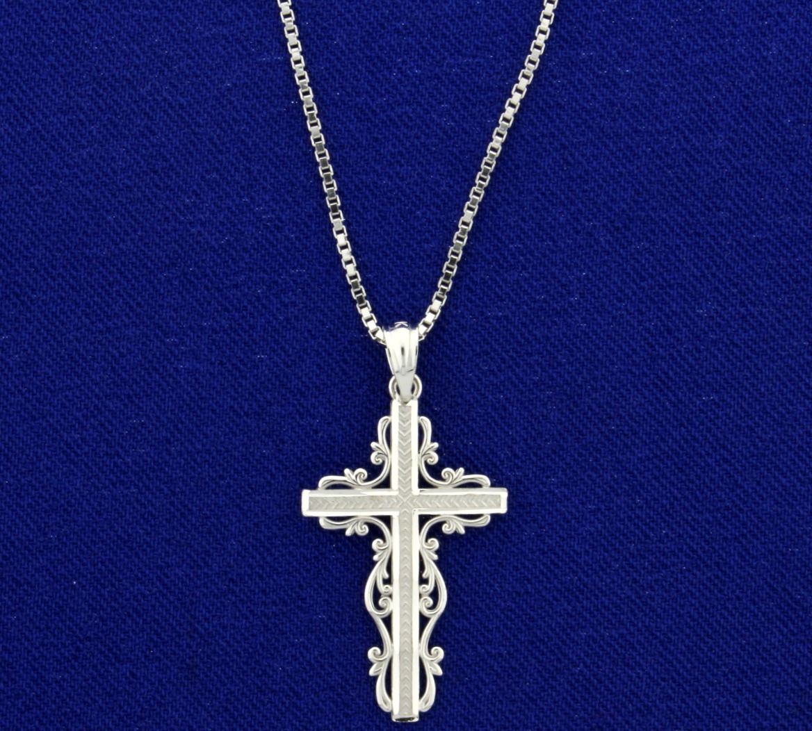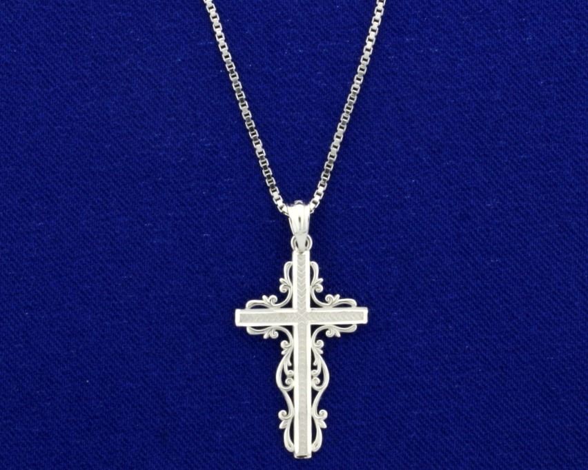 In 14k white gold. 18 1/4" long box link chain with lobster clasp and 1 1/4" long pendant with bale. Cross is highly detailed unique design. 4.4g.