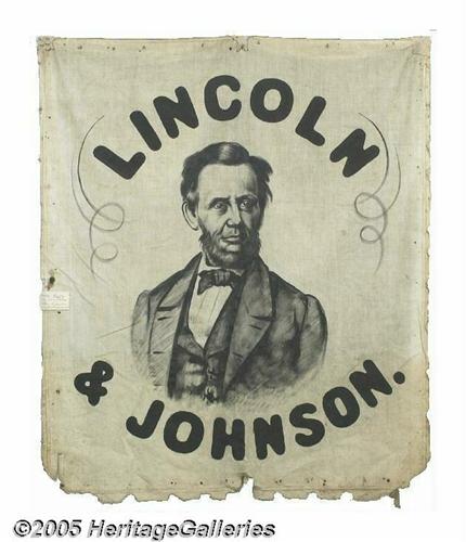 <B>Highly Important 1864 Abraham Lincoln Portrait Campaign Banner</B></I> Of course the most important aspect of this banner is that it is for Lincoln, by far the most-collected of any president or candidate. It features a highly distinctive portrait, unique to our experience, and comes from the much tougher 1864 election. To appreciate this banner one need only turn to Herbert Collins' monumental <I>Threads of History,</B></I> long the definitive reference work on American political textiles. Collins, who was curator of the political collection at the Smithsonian Institution, had access to all of the top institutional and private collections in the country when putting together his 1979 volume. Not counting bandanas, Collins lists just ten Lincoln portrait banners, six of which are commercially-made campaign flags. Not a single one of these banners is from the 1864 campaign, and except for a couple of Civil War patriotic bandanas, he lists no textile showing Abe wearing a beard! Like the hugh 1844 Henry Clay banner offered earlier in this catalog from the same source, it is in a remarkable state of preservation owing to the Hershey family's diligent care. It has no staining whatsoever, and only two trivial small tears at the bottom corners. The cloth has evenly "aged" a bit from its presumed original white to a soft beige tone. The perimeter is irregular in places, and rusty nail holes indicate that the edge was once folded around a wood stretcher-type frame. It would probably be a good idea to remount it in that same fashion, but we will leave that decision to the buyer. A literally "once in a lifetime" opportunity to obtain one of the great Lincoln political artifacts, and one of the best of all surviving American political banners! Measures 43" x 50". Lot:258