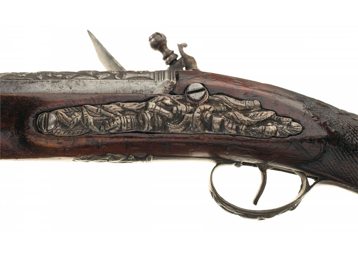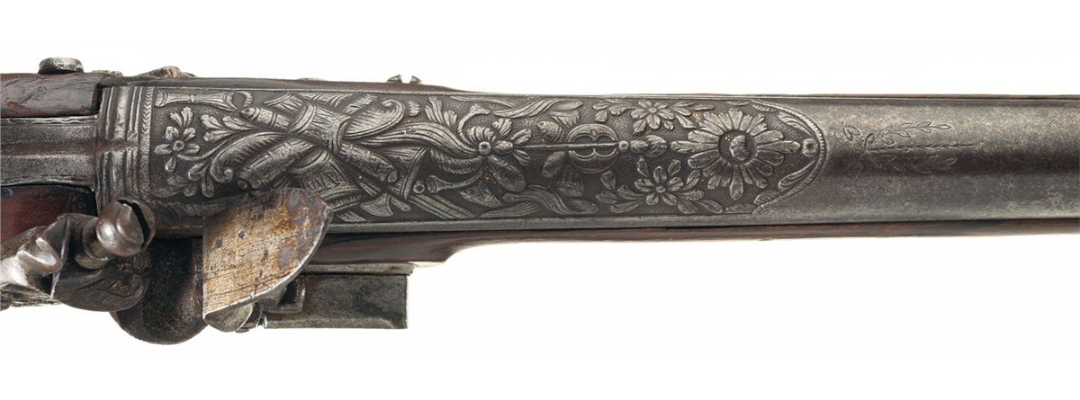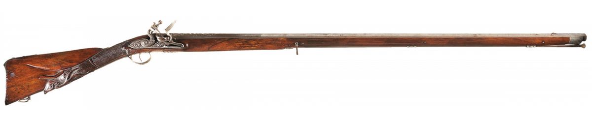This elaborately embellished European flintlock rifle features a 41 inch round barrel with a heart shaped silver front sight with a sunburst engraved design around it. Forward of the rear sight, the top of the barrel is high relief chiseled with floral designs and there are geometric patterns around the muzzle. Six inches of the top of the barrel at the breech features deep relief chiseling in floral and patriotic designs with a punch dot background. The lock, hammer, trigger guard and finial also have the same deep relief chiseling floral patterns and the left side plate has, what appears to be a ribbon design. There are no visible maker's marking. The rifle is mounted with a full walnut stock with a geometrically engraved silver forend cap, iron buttplate with deep relief engraved tang, silver ramrod pipes, checkered wrist and carved running deer (front half) on the bottom of the stock as well as a carved floral design on the left rear of the stock. The rifle is complete with sling swivels and an iron ramrod with brass trumpet head tip. These hand chiseled flintlock rifles were much rarer than the engraved ones and it was a big upgrade in the quality of the piece.