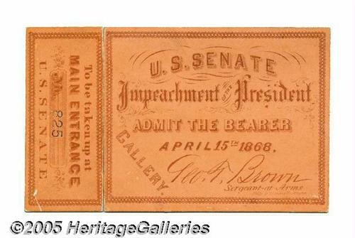 <B>Highly Popular Ticket to Andrew Johnson's 1868 Impeachment</B></I> Since President Bill Clinton's Senate trial, there has been a great deal of interest among collectors in the ephemera of the nation's other impeached President. This is an exceptionally clean example, and has the usually-missing stub (although detached, and held in place by a small piece of tape on reverse). Auction records on this item to over $1,500. 4.75" x 3". Lot:258