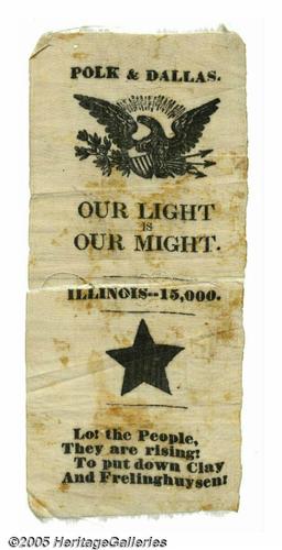 <B>Highly Unusual James K. Polk and George Dallas Ribbon</B></I> This 3" x 6 1/2" silk ribbon is the only one of its type we have encountered and it has a lot going for it. It depicts an eagle and star (representing the annexation of Texas) and reads, "Polk & Dallas. Our Light is Our Might. Illinois - 15,000. Lo! the People, They are rising! To put down Clay And Frelinhuysen!" Scattered light stains and separation across center (repairable) - displays well as is. Lot:256