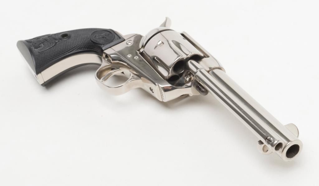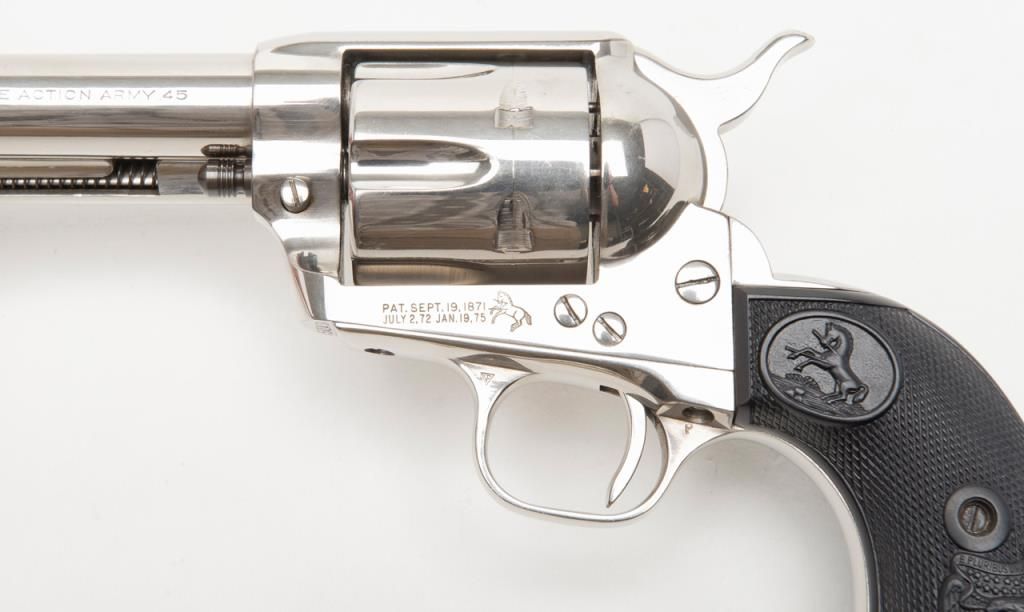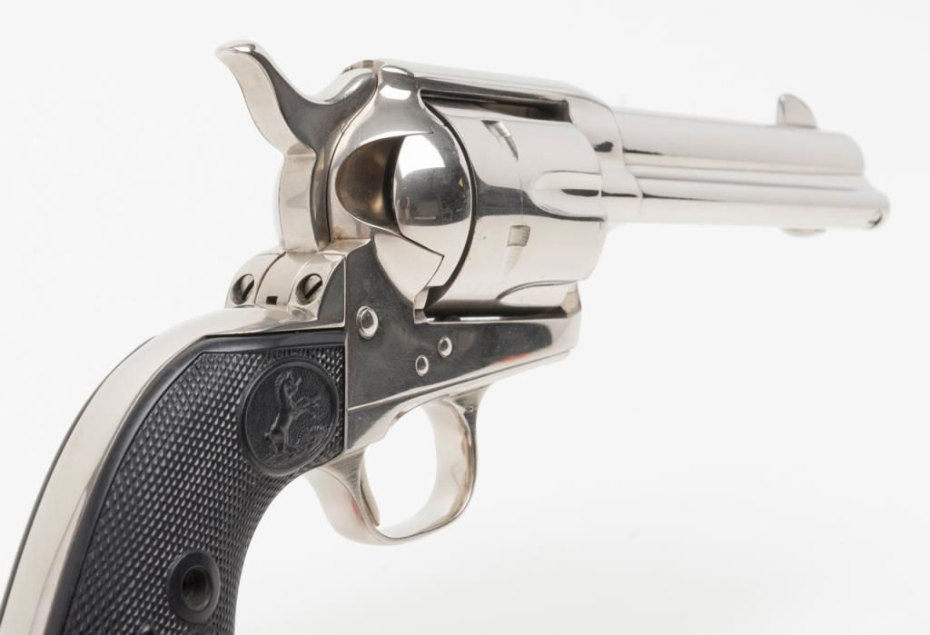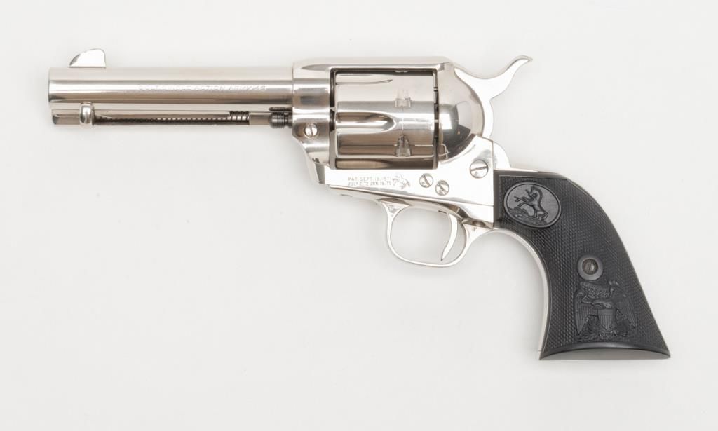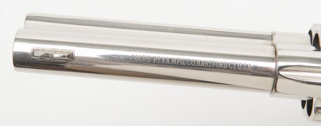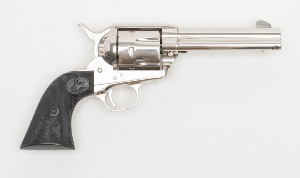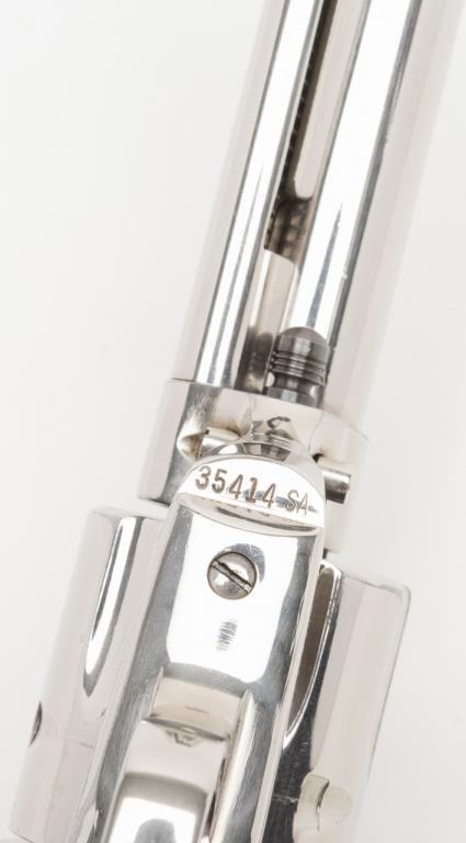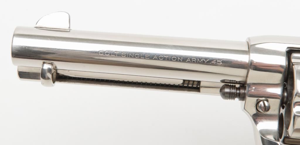 Highly collectible Colt SAA 2nd Generation revolver, .45 cal., 4-3/4” barrel, nickel finish, checkered hard rubber eagle grips, #35414SA, with factory letter dated Dec. 9, 1981 indicating this gun was originally shipped to legendary HollywoodWestern film and TV fast draw coach, Arvo Ojala, on Dec. 6, 1961, at 5219 Sepulveda Blvd, Van Nuys, CA., 1 gun in shipment. The gun is in overall excellent condition displaying the majority of its nickel finish and showing some firing and use,index line on cylinder; interior shows firing with blanks. Also included is a typed and hand corrected letter dated Feb. 3, 1983, Sahara Gun Show, Las Vegas, Nevada and signed at the bottom in pen and in pencil “Arvo Ojala” with thesalutation “Best of luck to Sterling Fenn”, covering information about Arvo’s work in Hollywood and about this particular Colt. The most important parts of the letter are that this gun, referenced by serial number, became hisfavorite working gun; that he re-worked the action for quick shooting and returned it to the factory to have it nickel plated (originally came blued) so “My purpose was to have a Colt six-gun of the same finish and style as one ordered from Colt on