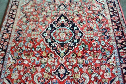 Highly collectible handmade antique Persian sarouk Rug. Made of 100% baby lamb and wool pile on cotton foundation, all natural vegetable dye, incorporating a highly detailed floral arabesque design on a rich red background; with a beautiful dual headed floral centerpiece medallion, multi layered crowned corners and dark floral trim From sarouk-Iran. About sarouk Rugs: Sarouk Ferahan Rugs are among the most luxurious classically derived, room-sized Persian carpets. they were produced in the arak region, not far from where fereghans and Sultanabad's were made. Some of the early examples were so closely related to fereghans that they have been designated as sarouk-fereghans. While the latter tend to have medallion designs, Sarouk carpets from about 1900 onward were mostly produced in an allover format, with dense sprays or bouquets of flowers and vines arrayed across the carpet symmetrically, on a deep blue or burgundy ground. this latter type is known for its soft, velvety wool and fairly thick pile. Size: 6 feet 7 inches X 4 feet 7 inches. Country of origin: Iran.