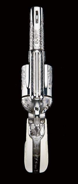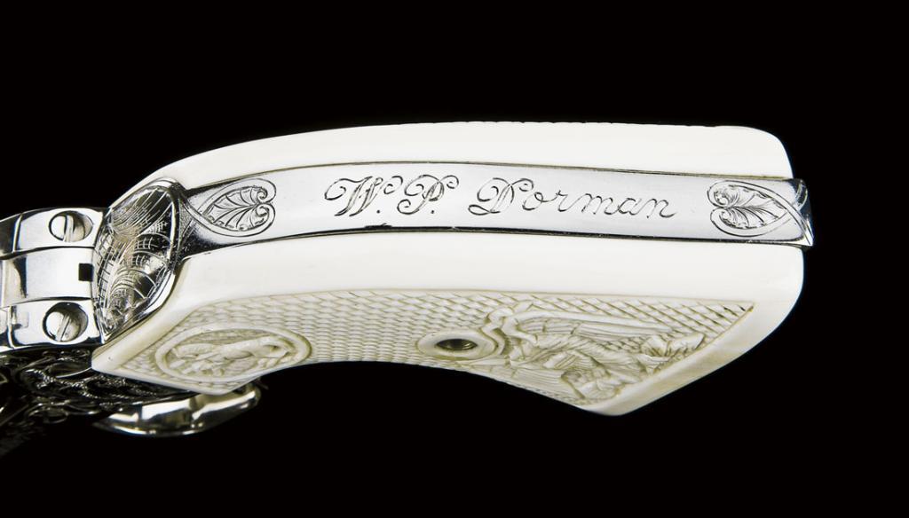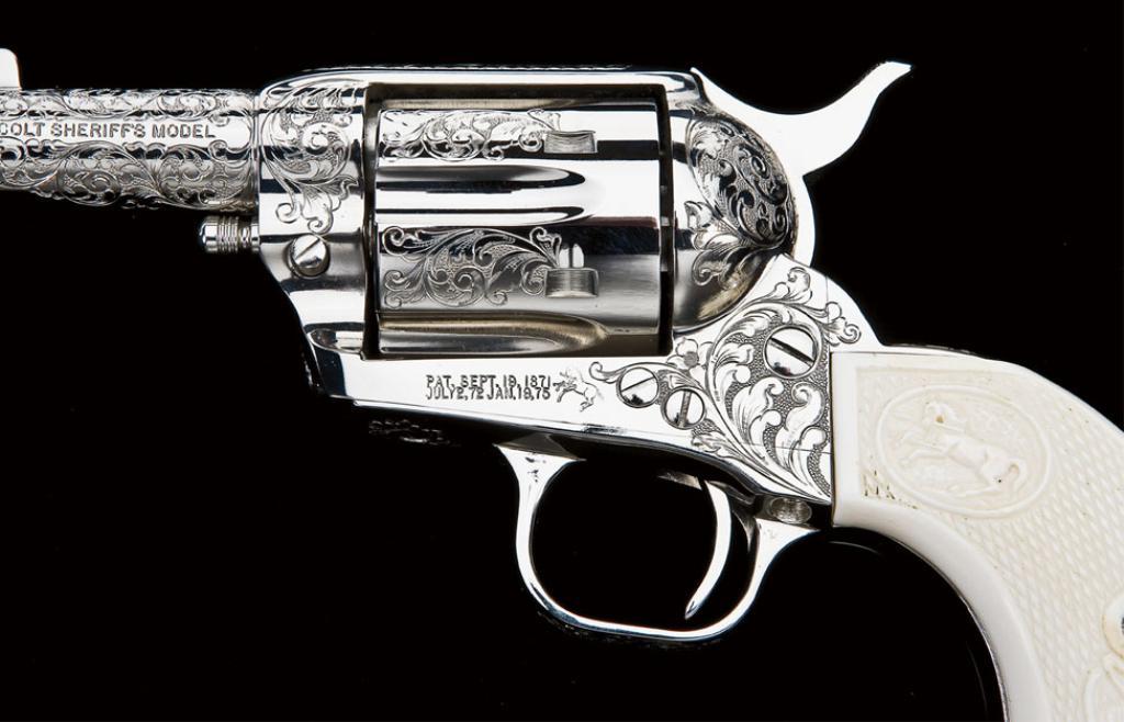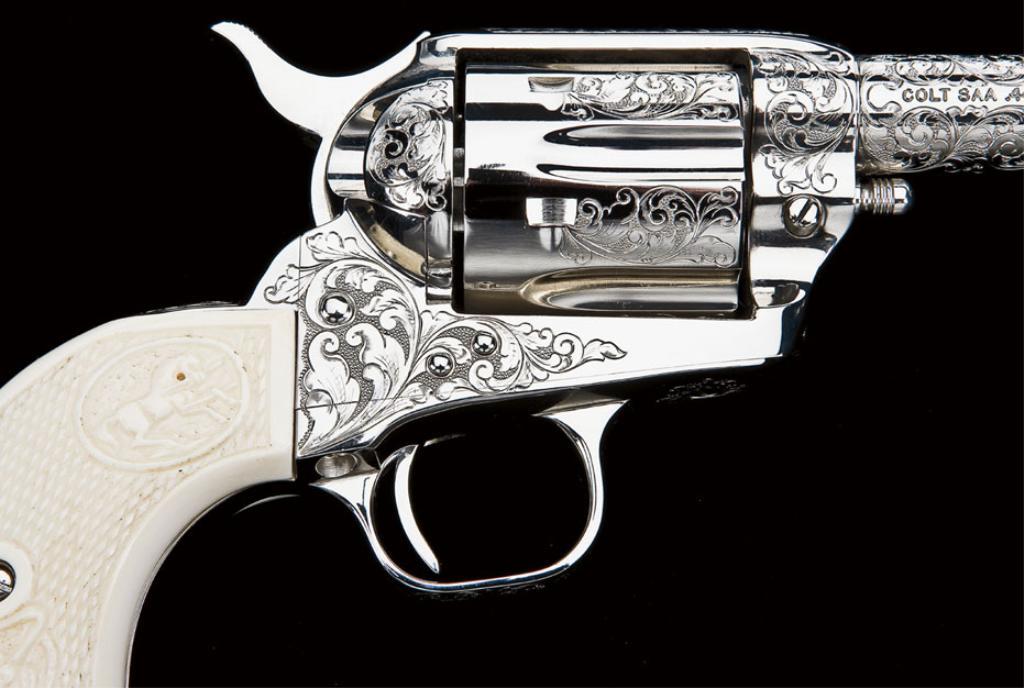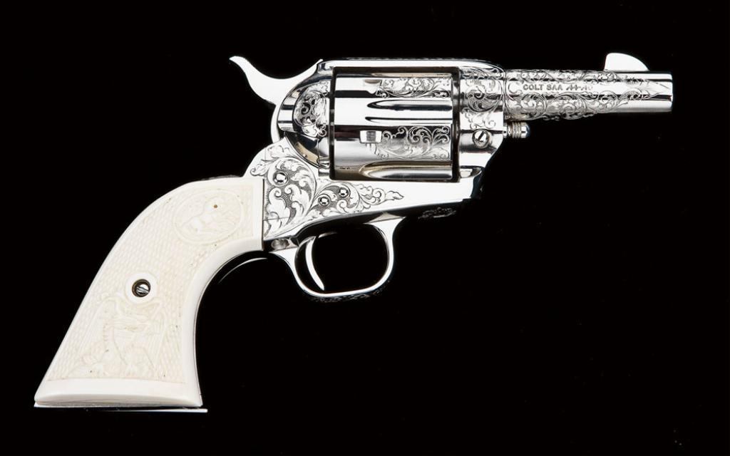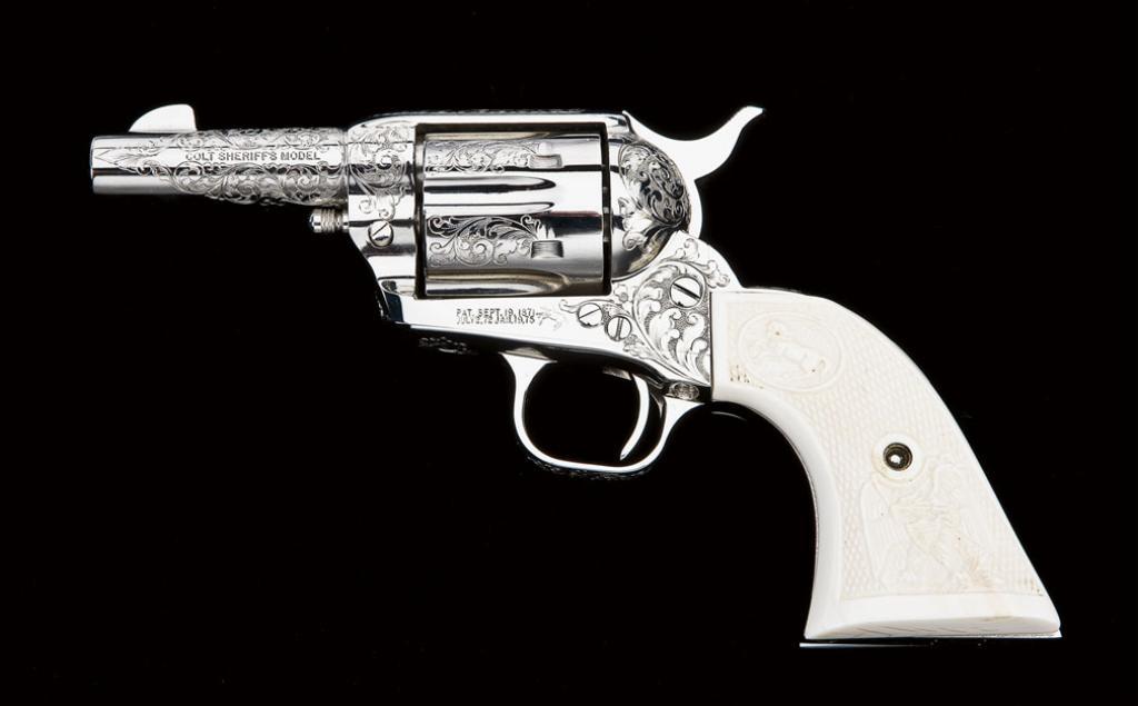Highly customized and engraved Colt SAA third generation Sheriff’s Model SAA revolver, 44-40 cal., 3” barrel, nickel finish, thick finely checkered and raised carved paneled ivory grips showing the traditional RampantColt on both sides and the spread eagle on both sides as was the custom on earlier SAAs of the 1880, #SA38972. This gun was engraved and signed by Colt Custom Shop Master Engraver Jan Gwinell and inscribed on thebackstrap “W. P. Dorman”. The gun is in overall like new condition showing extensive scroll engraving with stippled background on the barrel, frame, cylinder, loading gate and straps. The grips are expertly accomplishedand display a mellow yellow ivory color. Est.: $3,500-$7,000.