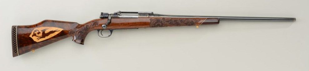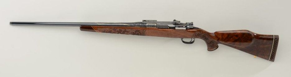Highly customized and sporterized Mauser bolt-action rifle, .25-06 cal., 24-1/2” barrel, blue finish, extensive deep scroll engraving with gold inlaid trim, jeweled bolt, scope mount; deluxe fancy grained woodstock with carved scroll work and hard rubber butt pad. This gun is in overall fine condition as customized with a fine bore, crisp action and beautiful wood including an inlaid running buck on right side of buttstock accented with light wood background. Est.: $400-$800.