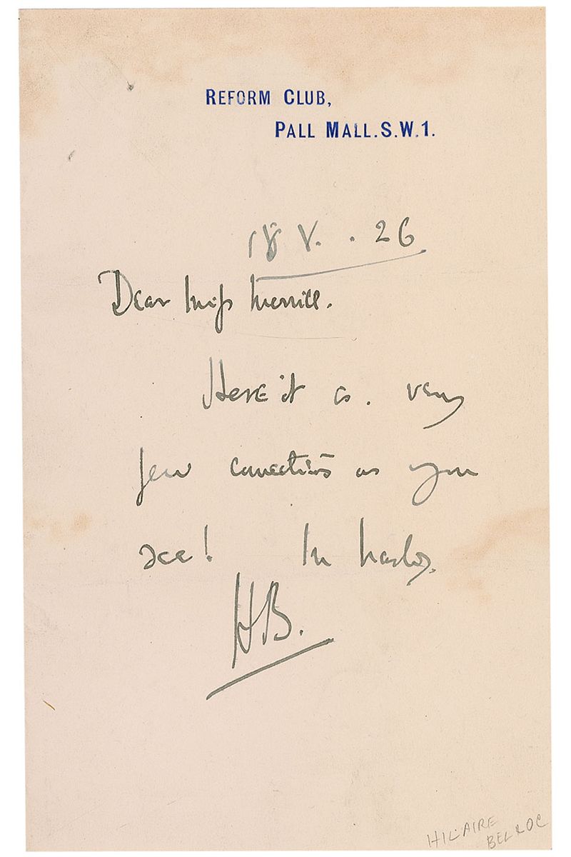 Writer (1870–1953) who was one of the most prolific writers in England during the early twentieth century. ALS signed “H. B.,” one page, 4.5 x 7, Reform Club letterhead, May 18, 1926. Brief letter to a woman. In full: “Here it is. Very few connections as you see!” In very good condition, with two pinholes to top left, scattered toning, pencil notation to bottom, and paper loss to blank second integral page.