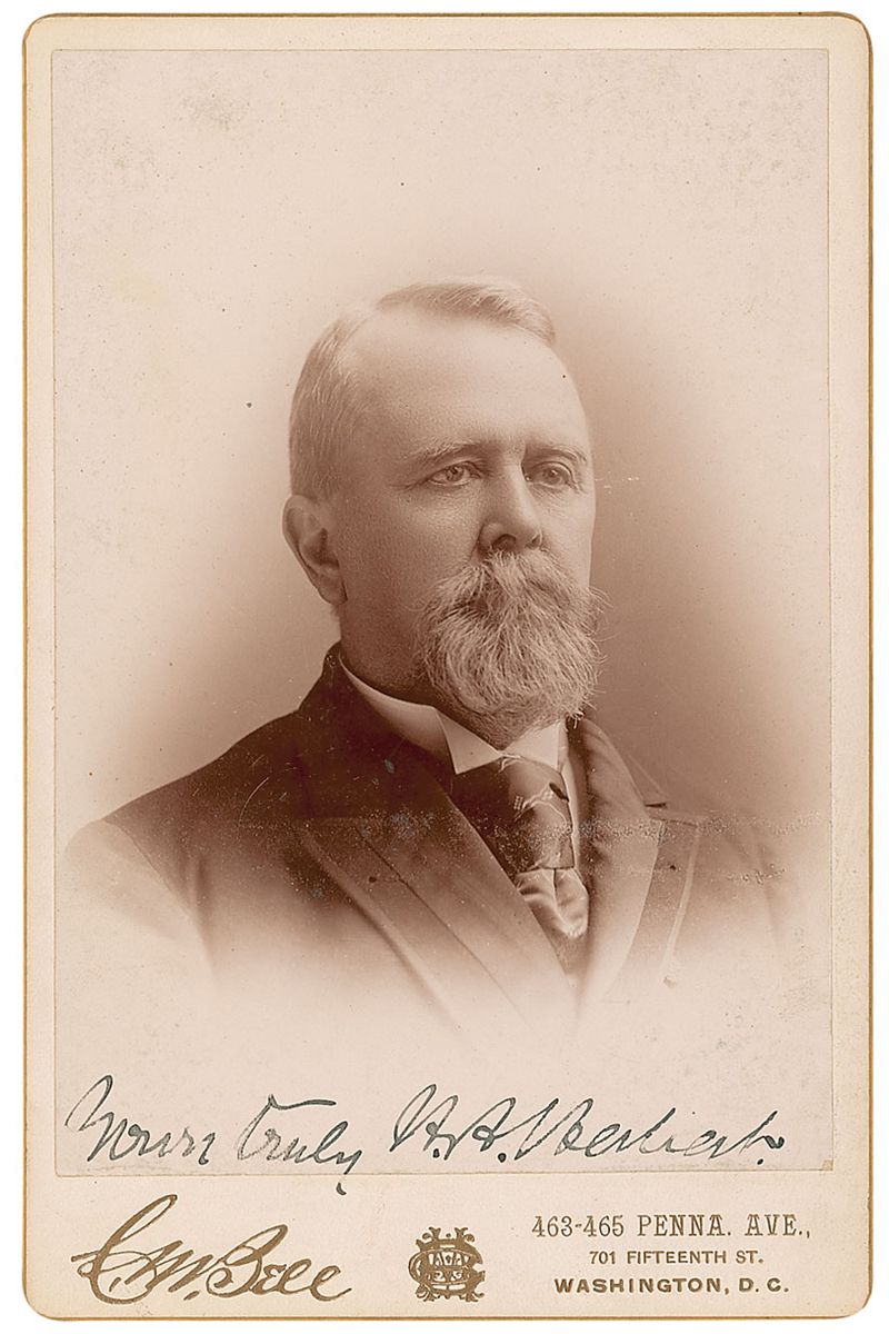 Politician who served as secretary of the navy under Grover Cleveland (1834–1919). Original 4.25 x 6.5 cabinet photo by C. M. Bell of Washington, signed at the bottom of the image in black ink, “Yours truly, H. A. Herbert.” In fine condition.