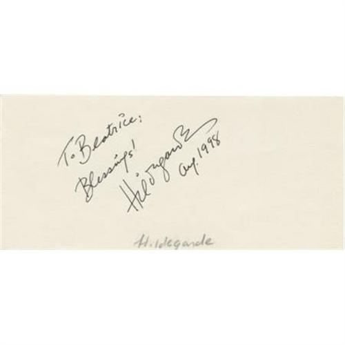 <B>Hildegarde Autograph.</B></I> A 3.5" x 8" card signed by Hildegarde in 1998. The celebrated cabaret singer (best remembered for her song "Darling, Je Vous Aime Beaucoup") autographed the card in black ink; her signature is large and clean. In Excellent condition though there is additional print along lower border in pencil (in an unknown hand).<BR><BR><b>Shipping:</b> Flat Material, Small (<a target="_blank" href="http://www.heritageauctions.com/common/shipping.php">view shipping information</a>)
