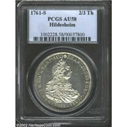Hildesheim. Frances I 2/3 Thaler 1761S, KM100, AU58 PCGS. An elusive issue, especially in this grade and exceptional quality of strike. Important notice: We expect to be auctioning lots at the rate of 200-250 per hour. Sometimes eBay Premier live bid software cannot keep up with that pace, so we strongly recommend that you place a realistic proxy bid now as insurance to avoid disappointment. Also please note that all Heritage/CAA lots purchased through eBay Premier carry a 20% Buyer's Premium. Please make sure you read the Terms and Conditions.