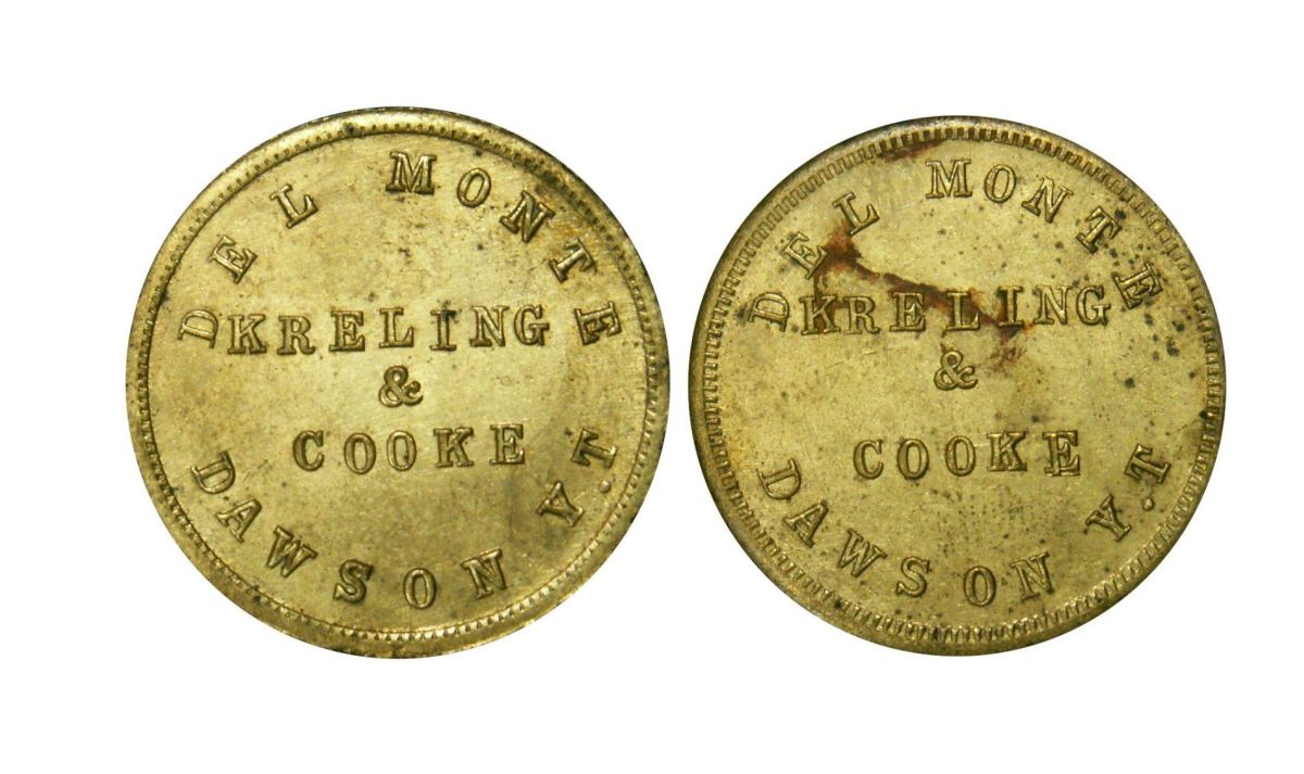 Hill-Simpson (Yukon Numismatica) Number Y1800b “Del Monte Kreiling & Cooke, Dawson, Y.T.” saloon token. Brass issue. Much lustrous AU-UNC. Listed Rarity 8 (only 3 to 5 known pieces). One of the rarest Yukon Territory token and dozens of times rarer than the H.B.C. “Made Beaver” tokens. Only piece seen by the cataloguer in the past 10+ years.