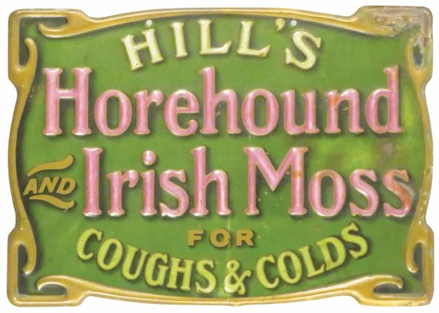 Hill's Horehound and Irish Moss for Coughs & Colds Embossed Die Cut Tin Sign. Paint loss top right corner and 3:00 otherwise very good condition. 9 1/4 X 6 1/2 inches.