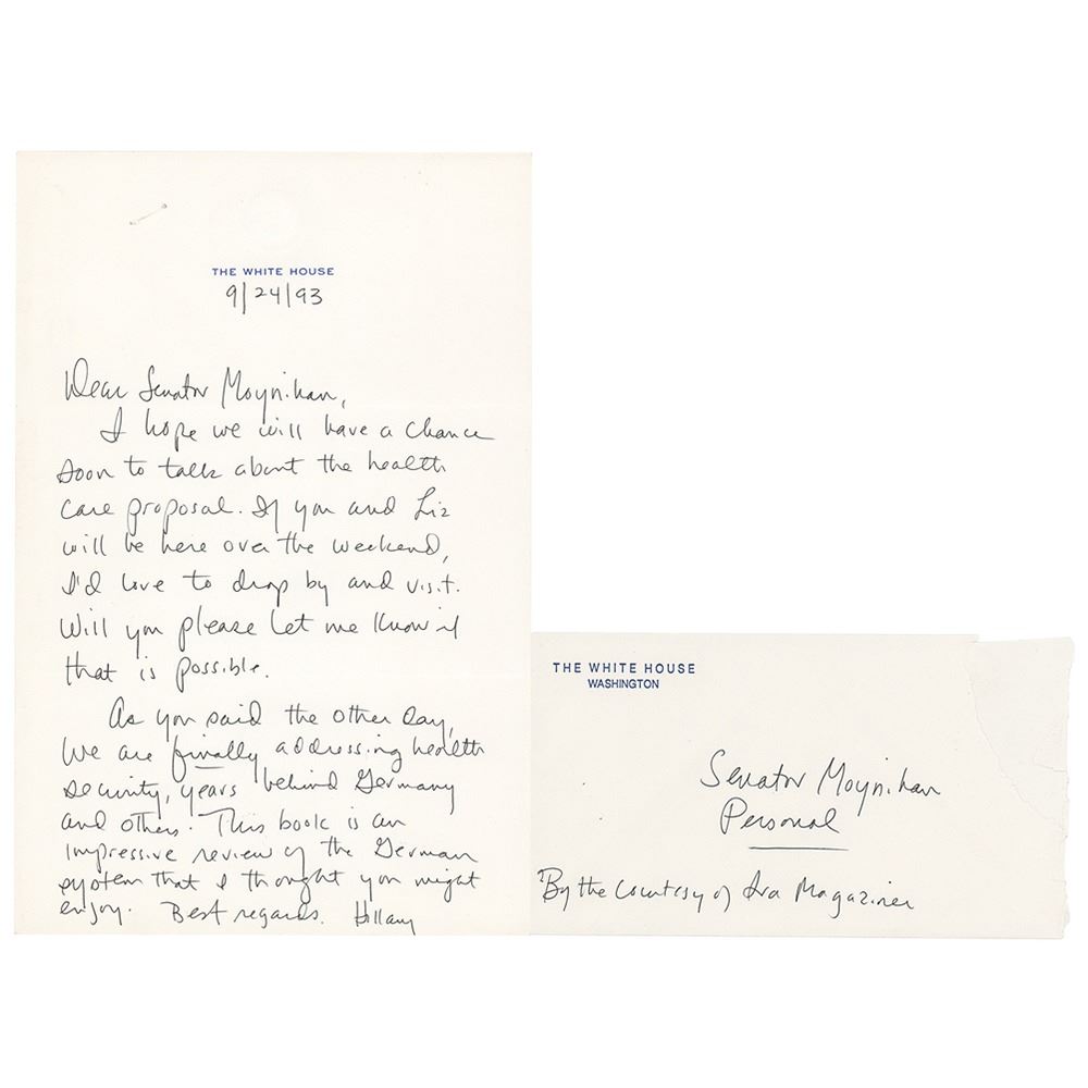 ALS as first lady, signed ‰ÛÏHillary,‰Û one page, 6.25 x 9.5, White House letterhead, September 24, 1993. Letter to Senator Daniel Patrick Moynihan, in full: "I hope we will have a chance soon to talk about the health care proposal. If you and Liz will be here over the weekend, I'd love to drop by and visit. Will you please let me know if that is possible. As you said the other day, we are finally addressing health security, years behind Germany and others. This book is an impressive review of the German system that I thought you might enjoy." In fine condition, with staple holes to the top. Accompanied by the original transmittal envelope, addressed in Clinton's hand.