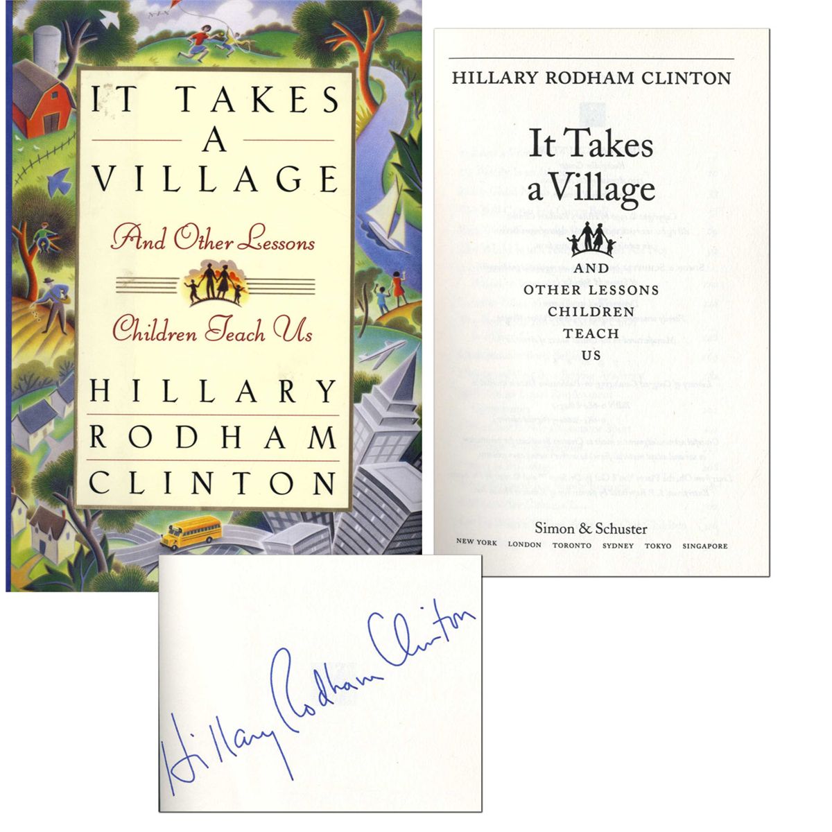 Hillary Clinton signed copy of her book ''It Takes a Village,'' with a large autograph upon the front fly-leaf, ''Hillary Rodham Clinton'' in blue fountain pen. Simon & Schuster: New York: 1996. 318pp. book is in near fine condition, as is its dustjacket. Measures 5.5'' x 7.75''. Overall, a beautiful copy of the First Lady's book.