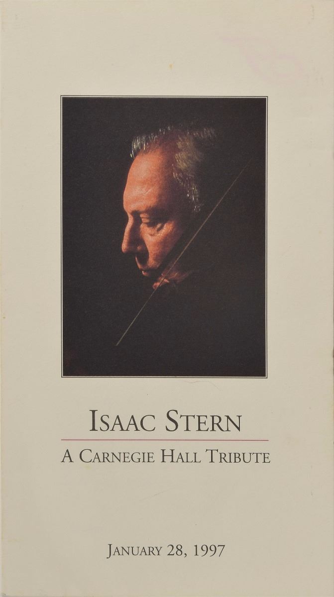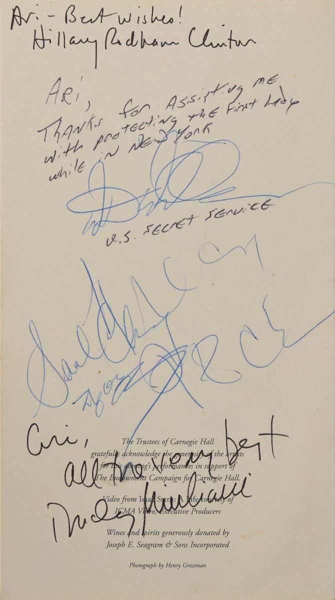 Tri-fold program for a tribute to Isaac Stern at Carnegie Hall on January 28, 1997, 5 x 9, signed and inscribed on the rear panel in black felt tip as first lady, "Ari—Best wishes! Hillary Rodham Clinton" and "Ari, all the very best, Rudy Giuliani." Also signed by Gregory Peck, a secret service agent, and one other. In fine condition, with some brushing to signatures.