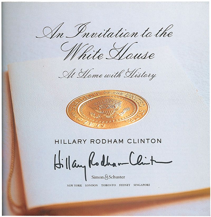 Signed book: An Invitation to the White House. First edition, first printing. NY: Simon & Schuster, 2000. Hardcover with dustjacket, 10.5 x 10.5, 311 pages. Signed on the title page in black felt tip, “Hillary Rodham Clinton.” In fine condition, with a bit of scattered light wear and creases to dustjacket.