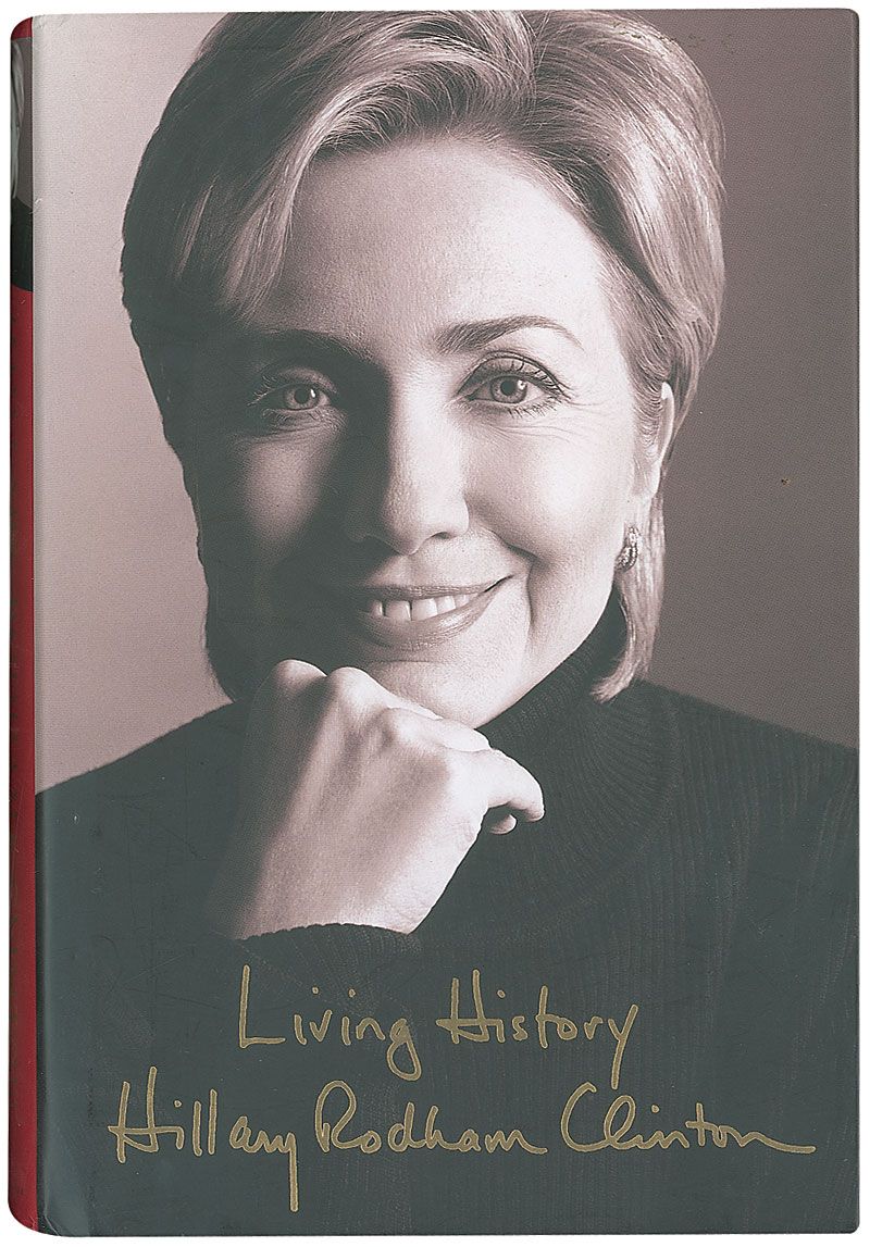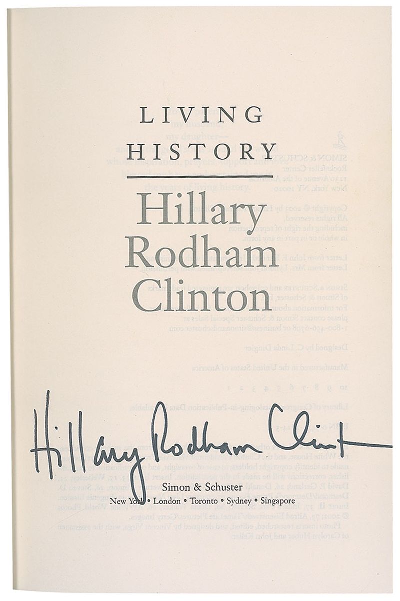Signed book: Living History. First edition, first printing. NY: Simon & Schuster, 2003. Hardcover with dust jacket, 6.5 x 9.5, 562 pages. Signed in black felt tip on the title page, “Hillary Rodham Clinton.” In fine condition, with scattered light wear to