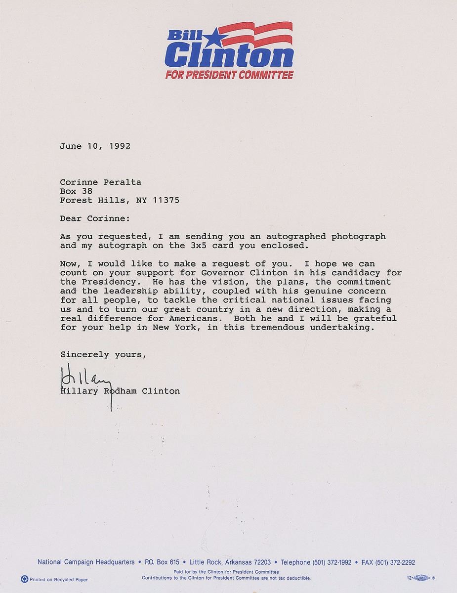 TLS signed “Hillary,” one page, 8.5 x 11, Bill Clinton for President Committee letterhead, June 10, 1992. Letter to Corinne Peralta, in part: “I hope we can count on your support for Governor Clinton in his candidacy for the Presidency. He has the vision, the plans, the commitment and the leadership ability, coupled with his genuine concern for all people, to tackle the critical national issues facing us and to turn our great country in a new direction, making a real difference for Americans. Both he and I will be grateful for your help in New York, in this tremendous undertaking.” In fine condition, with trivial soiling and some creasing to edges.