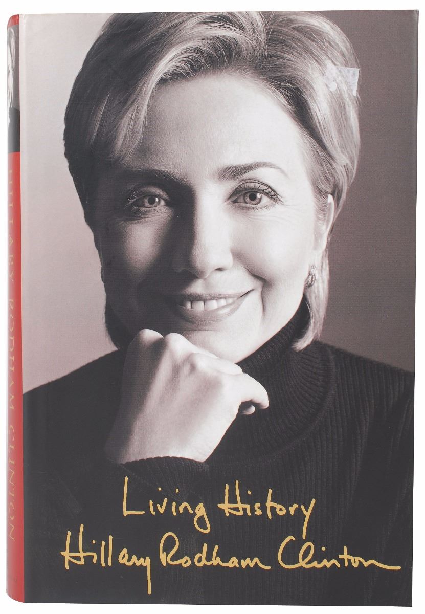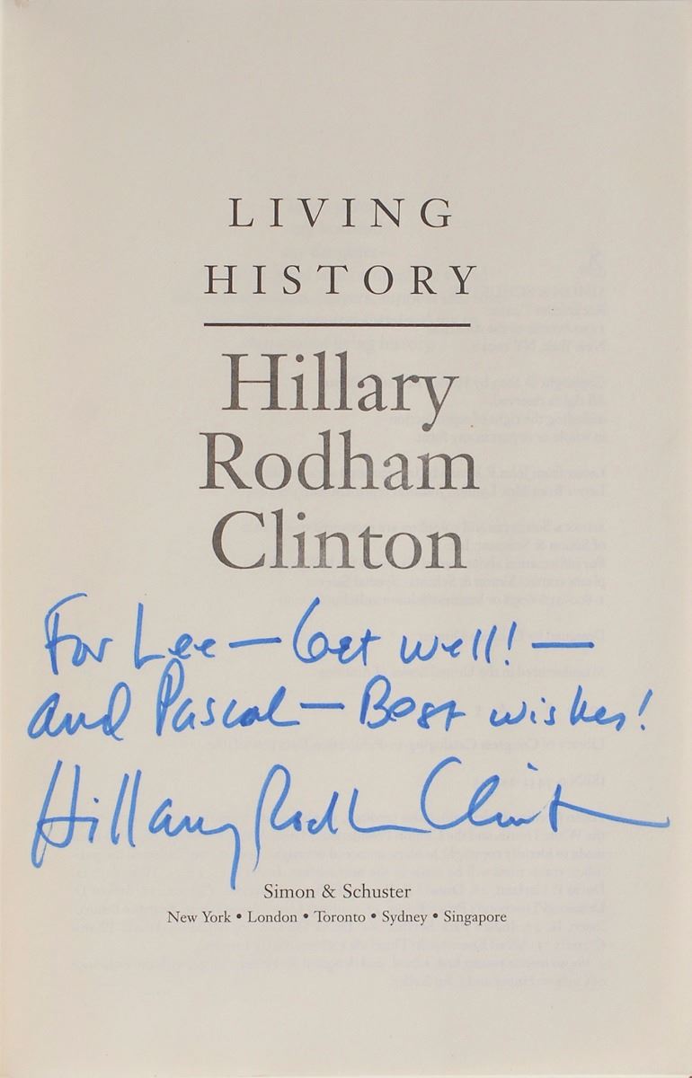 Signed book: Living History. First edition. NY: Simon & Schuster, 2003. Hardcover with dust jacket, 6.25 x 9.25, 562 pages. Signed and inscribed on the title page in blue felt tip, “For Lee—Get well!—and Pascal—Best wishes! Hillary Rodham Clinton.” In fine condition, with an ownership inscription to the first free end page and a photocopied image from a Clinton event affixed to the rear free end page.