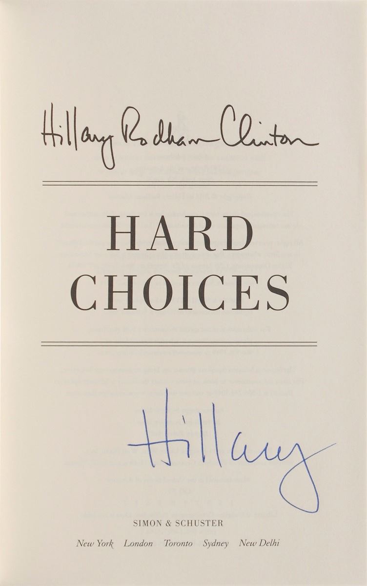 Signed book: Hard Choices. First edition. NY: Simon & Schuster, 2014. Hardcover with dust jacket, 6.5 x 9.5, 635 pages. Signed on the title page in blue felt tip, “Hillary.” In very fine condition.