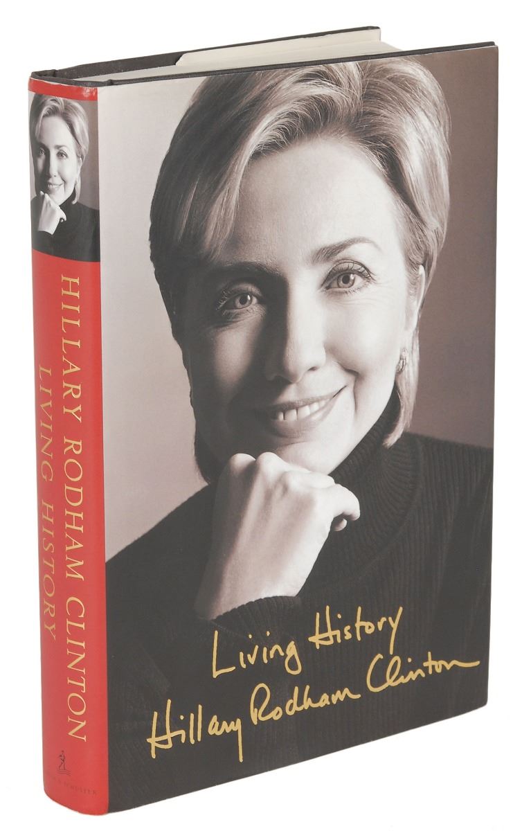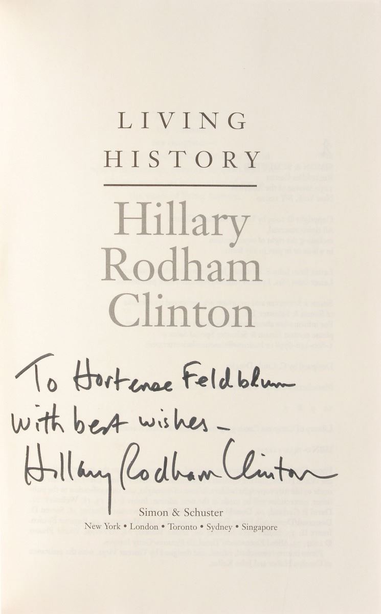 Signed book: Living History. NY: Viking Press, 2003. Hardcover with dust jacket, 6.5 x 9.5, 562 pages. Signed and inscribed on the title page in black felt tip, “To Hortense Feldblum, with best wishes—Hillary Rodham Clinton.” In fine condition.