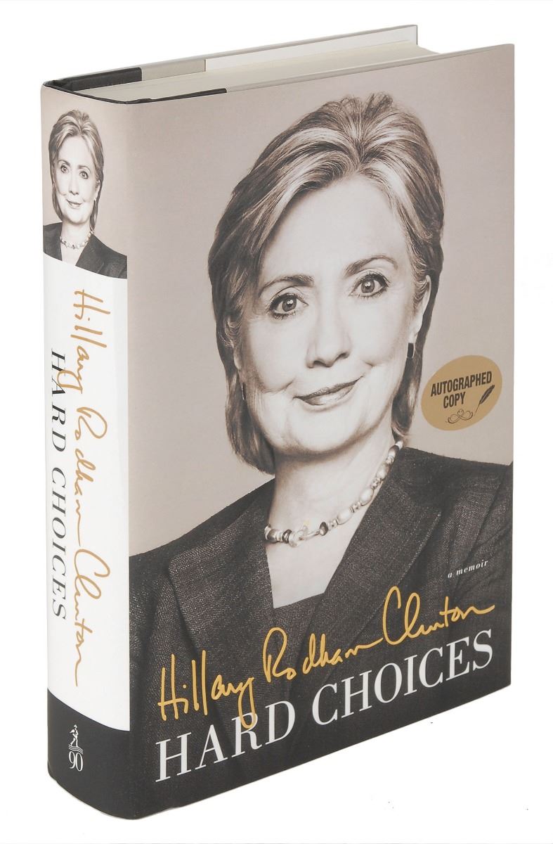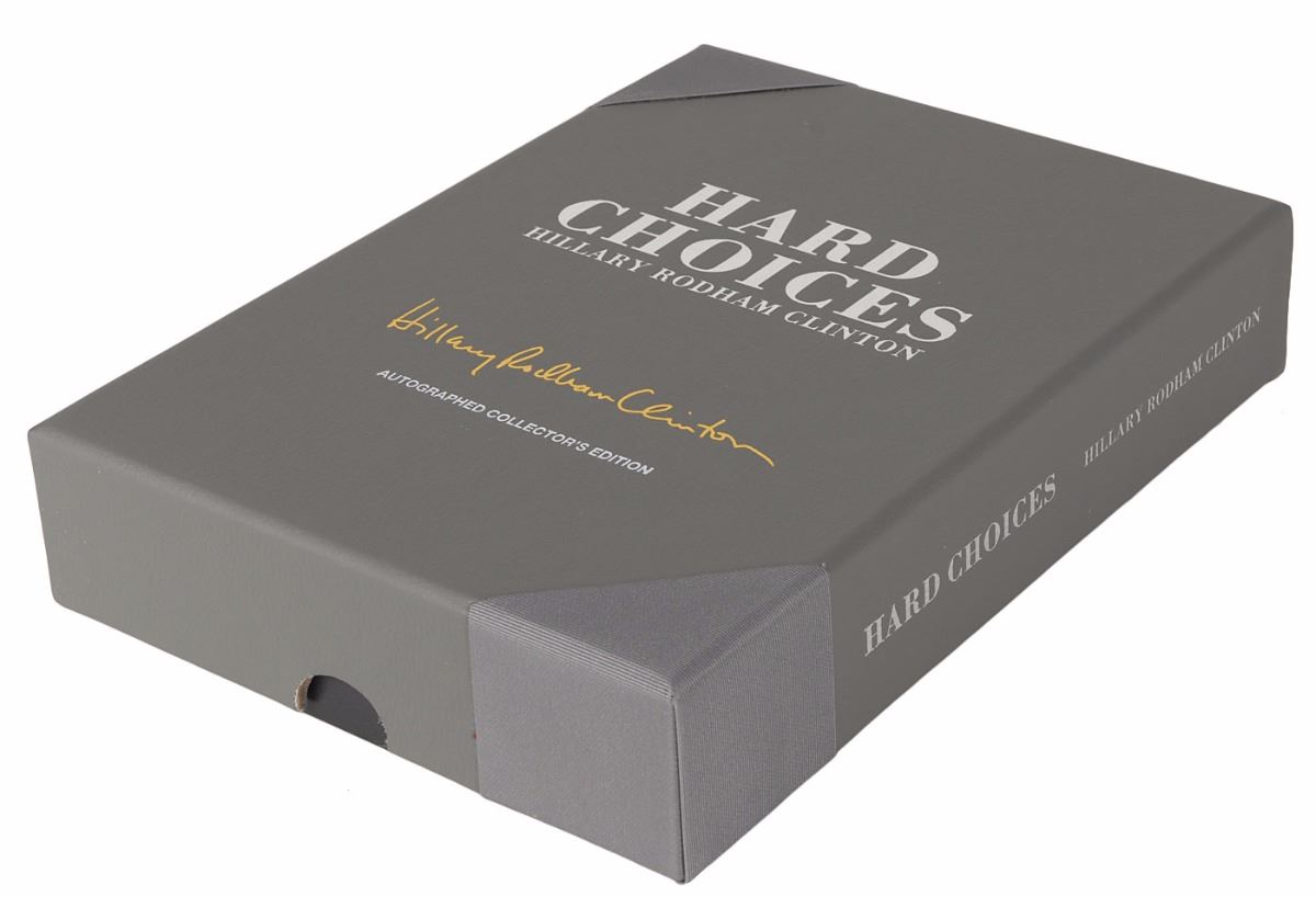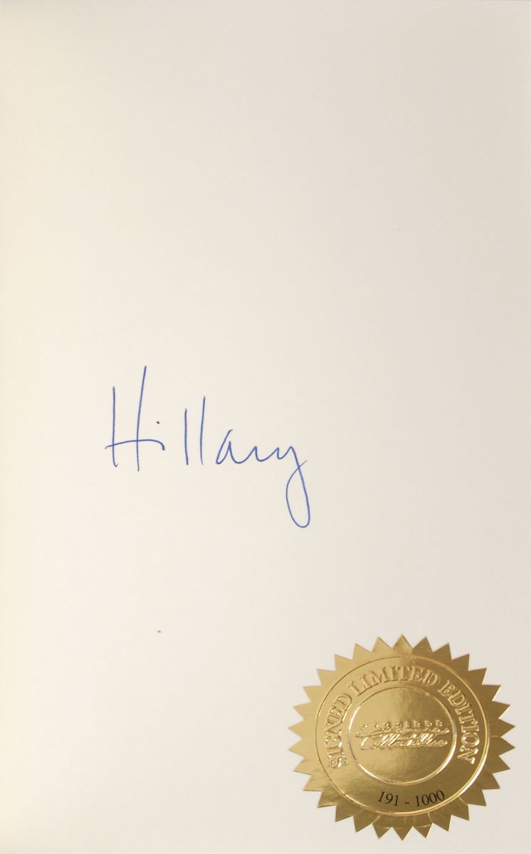 Signed book: Hard Choices. Limited autographed collector’s edition, numbered 191/1000. NY: Simon & Schuster, 2014. Hardcover with dust jacket, 6.5 x 9.5, 635 pages. Nicely signed on the first free end page, bearing an affixed gold seal, in blue ink, “Hillary.” Housed in an attractive leather-bound presentation case. In very fine condition.