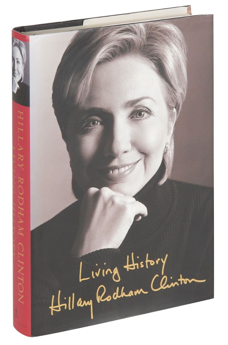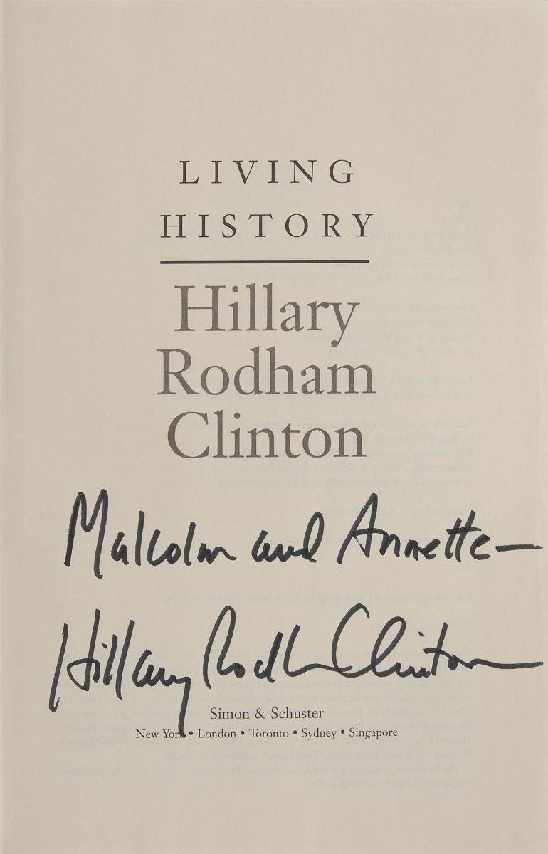 Signed book: Living History. NY: Simon & Schuster, 2003. Hardcover with dust jacket, 6.5 x 9.5, 562 pages. Signed and inscribed on the title page in black felt tip, “Malcolm and Annette—Hillary Rodham Clinton.” In fine condition.
