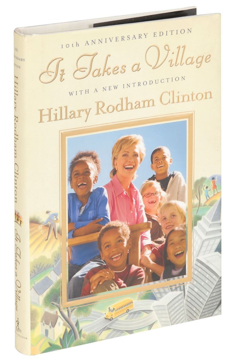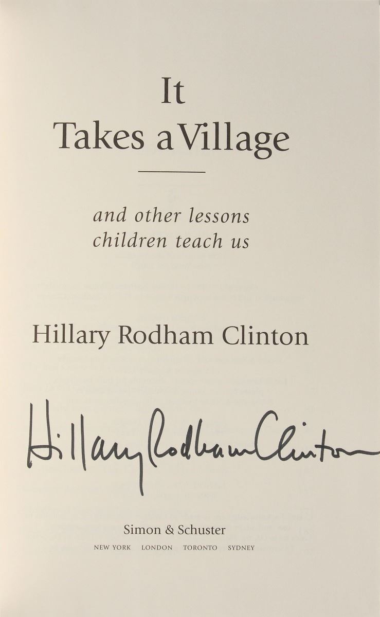 Signed book: It Takes a Village. Tenth anniversary edition, first printing. NY: Simon & Schuster, 2006. Hardcover with dust jacket, 6.75 x 9.5, 331 pages. Signed on the title page in black felt tip, “Hillary Rodham Clinton.” In fine condition.