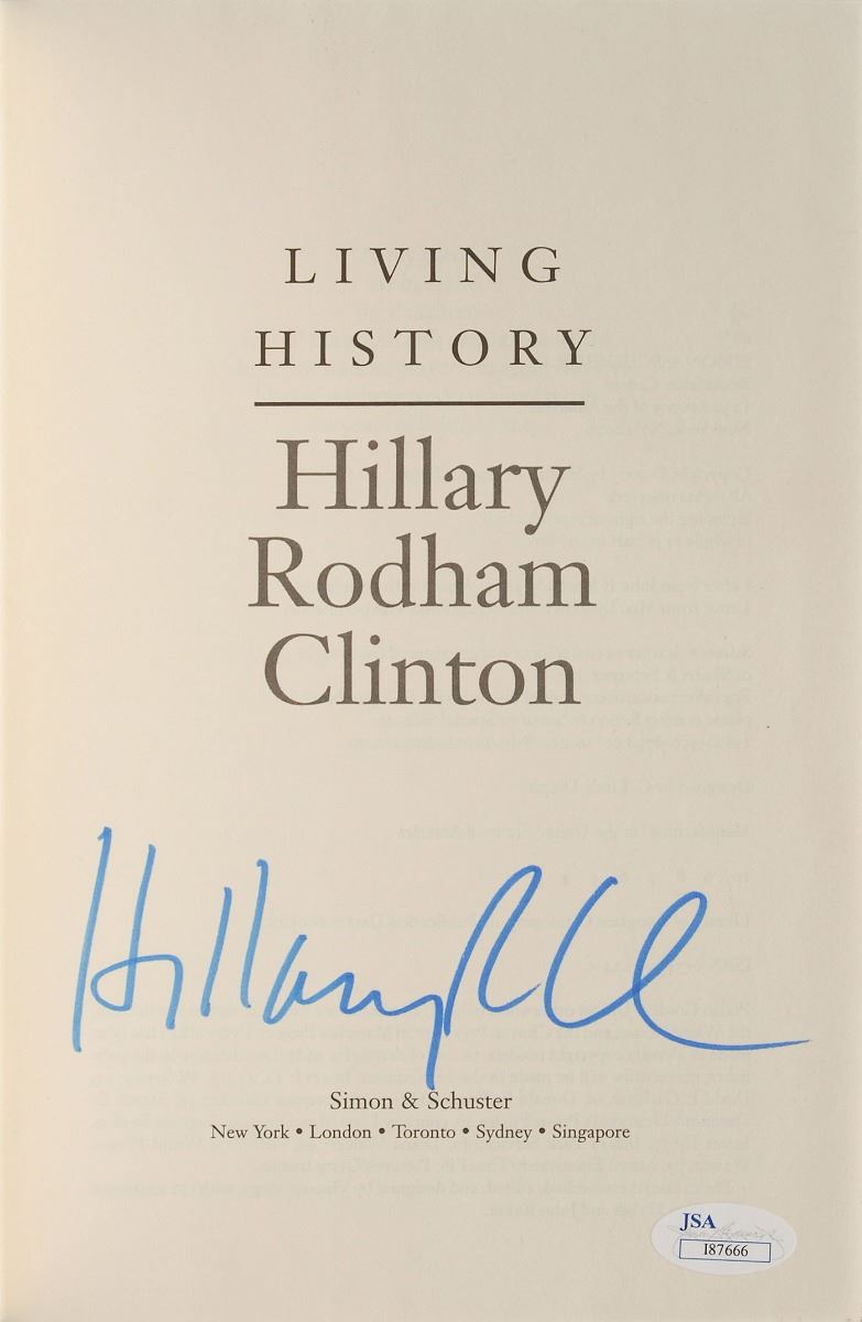 Signed book: Living History. First edition, first printing. NY: Simon & Schuster, 2003. Hardcover with dust jacket, 6.5 x 9.5, 562 pages. Signed on the title page in blue felt tip. In fine condition, with a JSA label affixed to the lower corner. Accompanied by a certificate of authenticity from JSA.