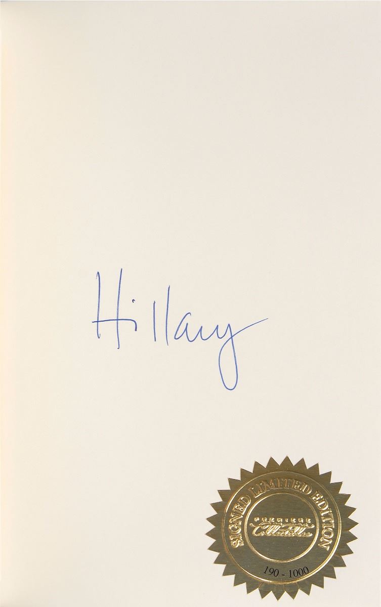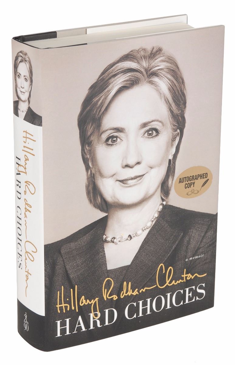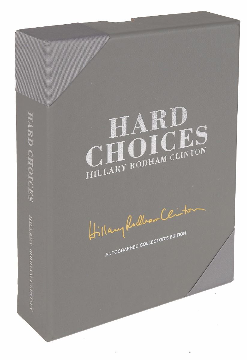 Signed book: Hard Choices. Limited autographed collector’s edition, numbered 190/1000. NY: Simon & Schuster, 2014. Hardcover with dust jacket, 6.5 x 9.5, 635 pages. Nicely signed on the first free end page, bearing an affixed gold seal, in blue ink, “Hillary.” Housed in an attractive leather-bound presentation case. In very fine condition.