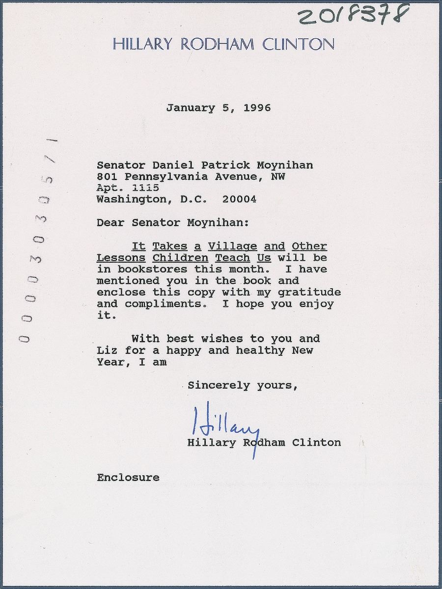 TLS as first lady, signed “Hillary,” one page, 6.25 x 8.5, personal letterhead, January 5, 1996. Letter to New York Senator Daniel Patrick Moynihan, in full: “It Takes a Village and Other Lessons Children Teach Us will be in bookstores this month. I have mentioned you in the book and enclose this copy with my gratitude and compliments. I hope you enjoy it. With best wishes to you and Liz for a happy and healthy New year.” In fine condition. Accompanied by a certificate of authenticity from JSA.