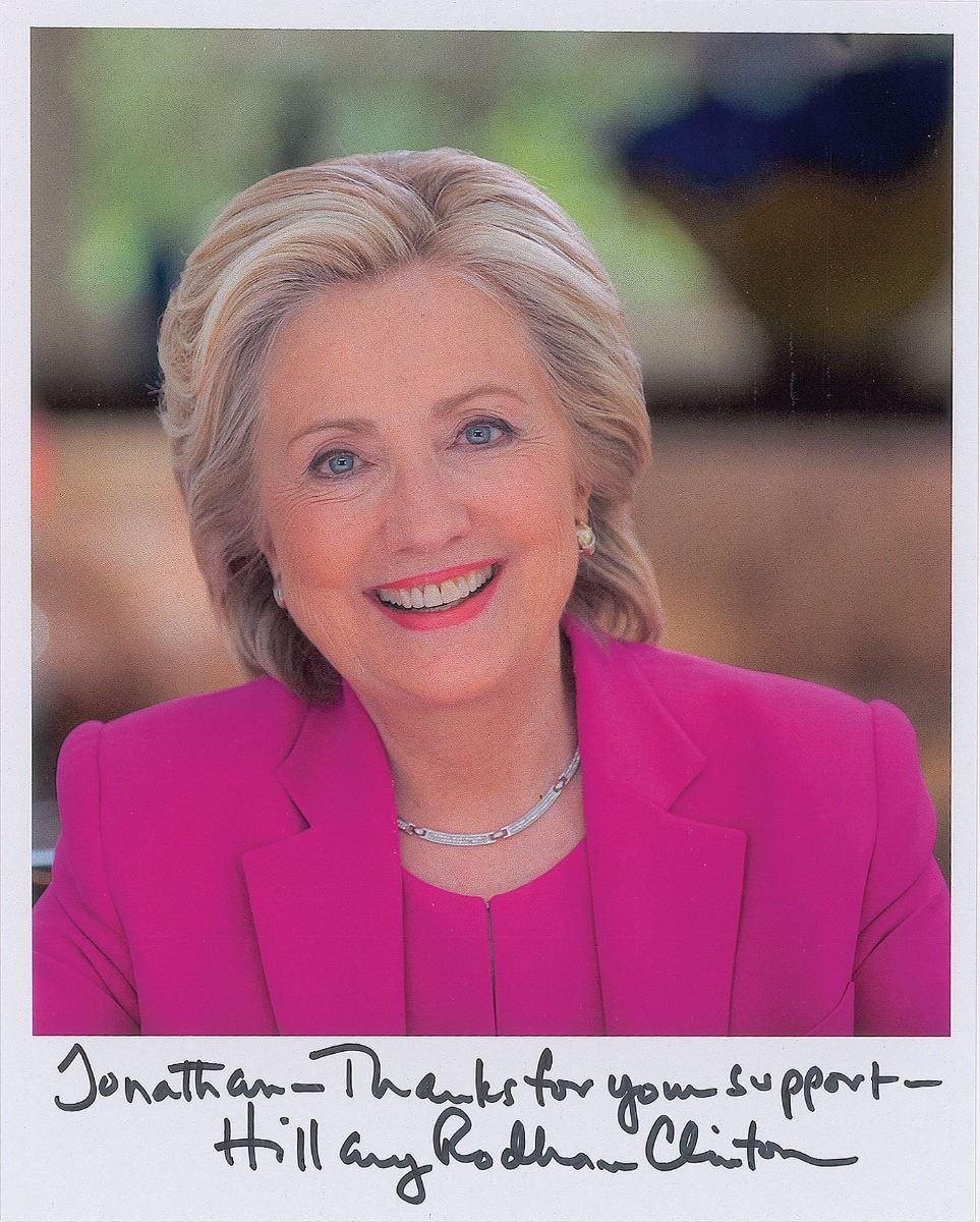 Desirable color semi-glossy 8 x 10 campaign photo of Hillary Clinton, signed and inscribed in the lower border in black felt tip, “Jonathan—Thanks for your support—Hillary Rodham Clinton.” Reverse bears a “Paid for by Hillary for America” stamp. In very fine condition.