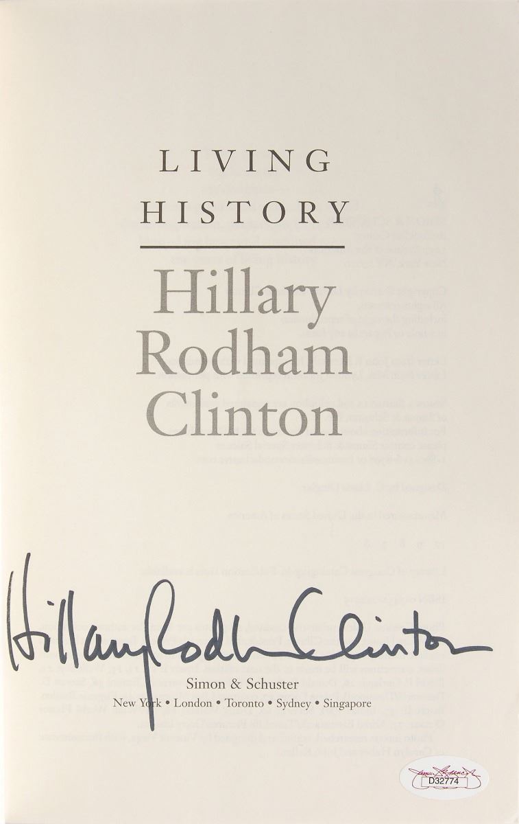 Signed book: Living History. NY: Simon & Schuster, 2003. Hardcover with dust jacket, 6.5 x 9.5, 562 pages. Signed on the title page in black felt tip, “Hillary Rodham Clinton.” In fine condition, with a JSA label affixed to the title page. Accompanied by a certificate of authenticity from JSA.