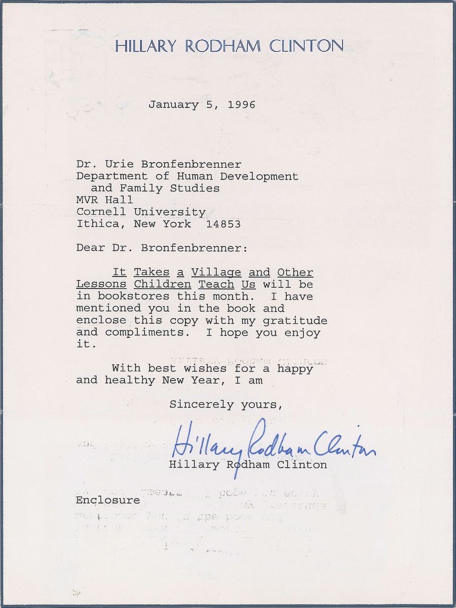 TLS signed “Hillary Rodham Clinton,” one page, 6.25 x 8.5, personal letterhead, January 5, 1996. Letter to Dr. Urie Bronfenbrenner, in part: “It Takes a Village and Other Lessons Children Teach Us will be in bookstores this month. I have mentioned you in the book and enclose this copy with my gratitude and compliments. I hope you enjoy it.” Affixed to a slightly larger scrapbook page. In very good to fine condition, with light staining and wrinkling from being affixed to the recipient’s scrapbook page, a portion of which still remains on the reverse.