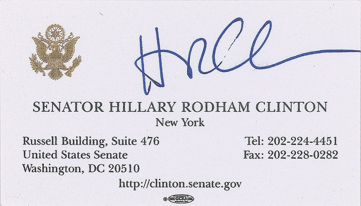 Official US Senate business card, 3.5 x 2, quickly signed in blue felt tip by Hillary Clinton. In fine condition.