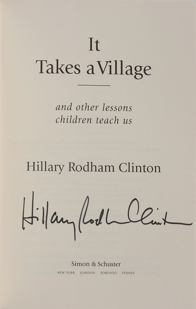 Signed book: It Takes a Village. Tenth anniversary edition, first printing. NY: Simon & Schuster, 2006. Hardcover with dust jacket, 6.75 x 9.5, 331 pages. Signed on the title page in black felt tip, “Hillary Rodham Clinton.” In fine condition.
